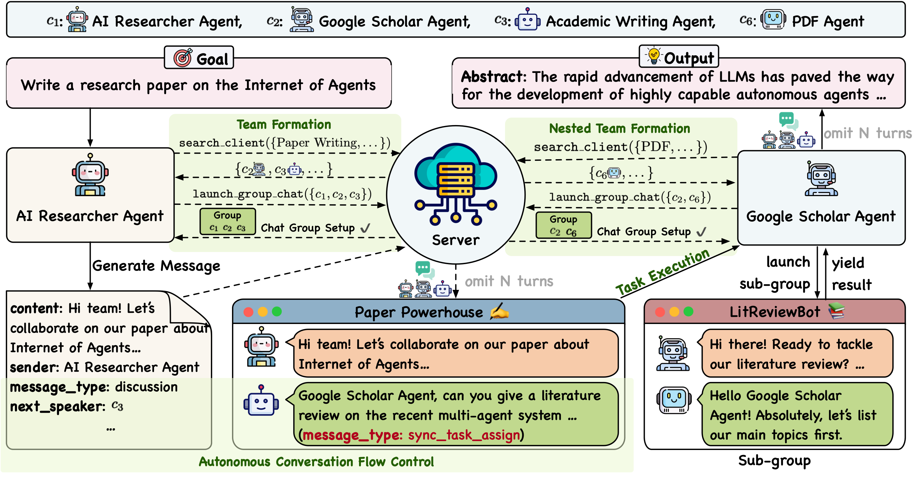 IoA 的核心亮点在于其独特的“类互联网”架构设计。它支持智能体自主形成嵌套式团队,灵活适应任务需求;能够异构集成不同特性的智能体,打造“全明星”阵容;并采用异步任务执行机制,显著提升系统整体效率。此外,其自适应的对话流管理确保了协作过程既结构化又充满灵活性,而高度可扩展的设计也让添加新类型智能体或应对新任务变得简单便捷。通过 IoA,构建高效、协同的下一代多智能体系统变得更加触手可及。