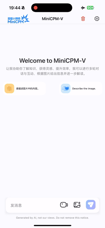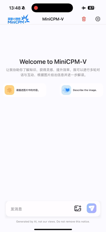 我们在iPhone 16 Pro Max上部署了MiniCPM-V 4.0,并提供了iOS演示。演示视频为未经编辑的原始屏幕录制。 模型动物园