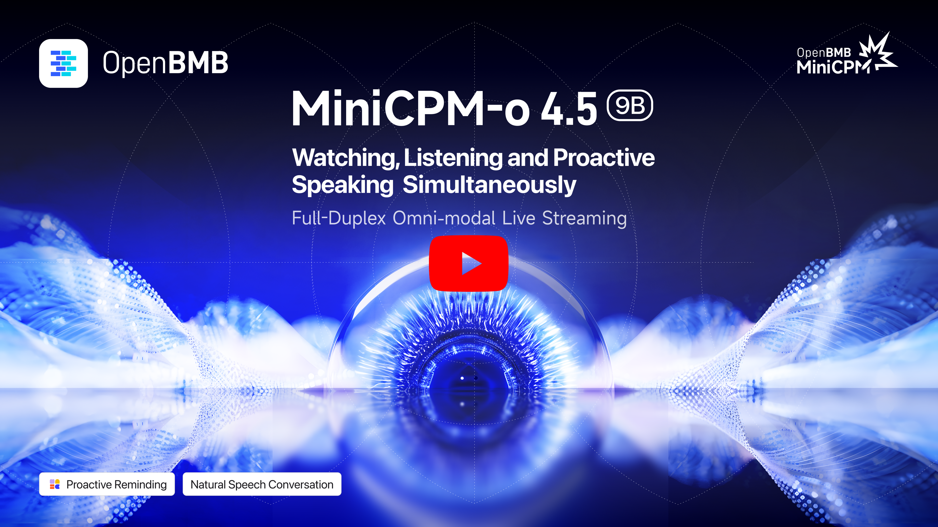 [2026年2月3日] 🔥🔥🔥 我们开源了MiniCPM-o 4.5,它在视觉和语音方面与Gemini 2.5 Flash相当,并支持全双工多模态实时流式交互。立即尝试吧!