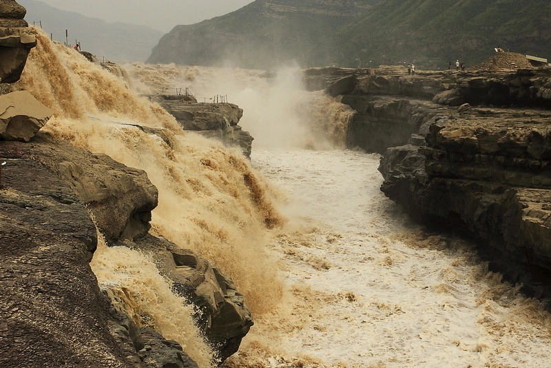 “黄河之水天上来,奔流到海不复回。” 李白的这句诗可以用来形容这幅图片中汹涌澎湃、波涛汹涌的景象:一条湍急的河流从山上奔腾而下,形成了一幅令人叹为观止的画面,展示出大自然的力量和雄伟壮丽。