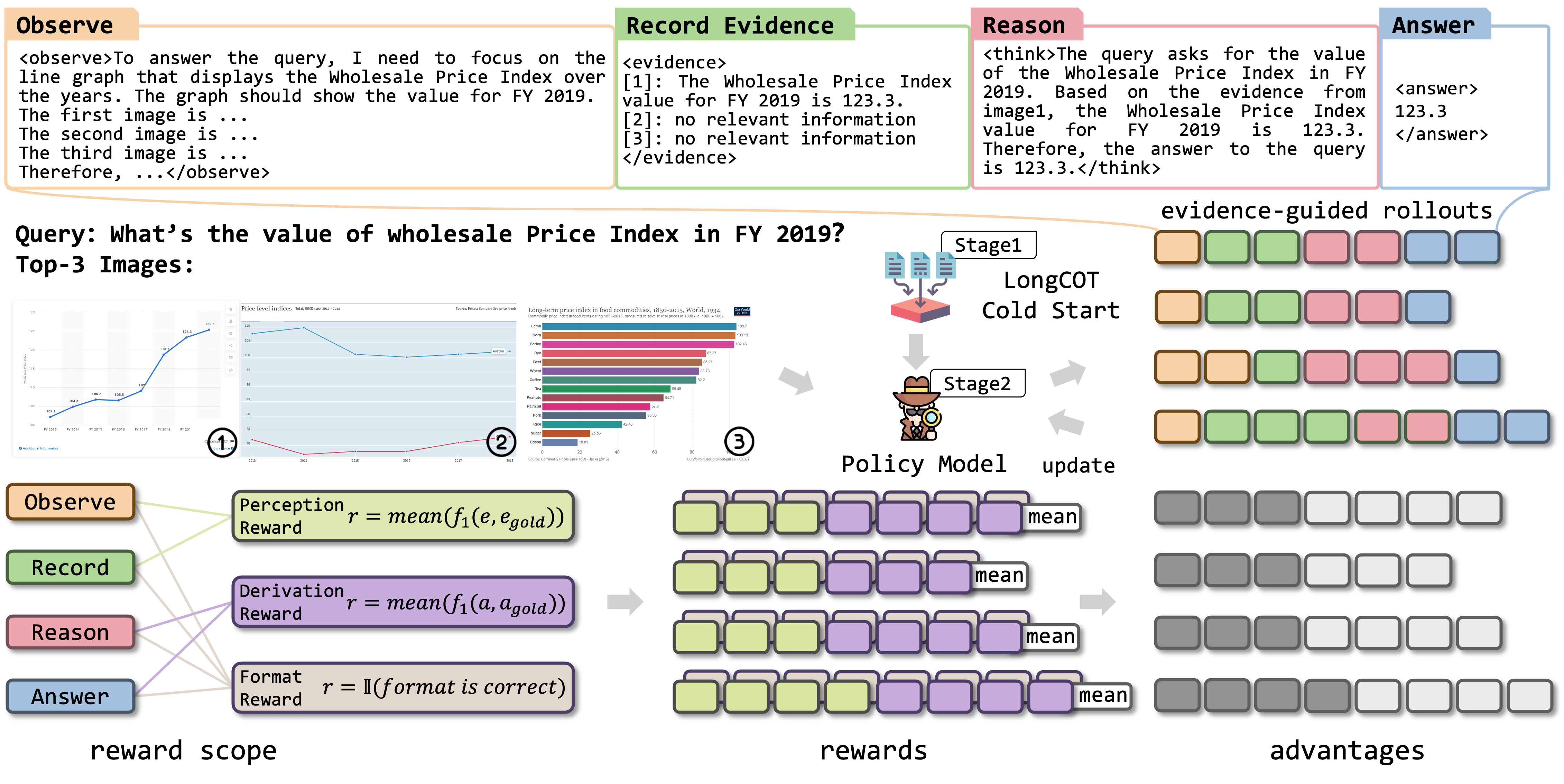 为了有效地训练EVisRAG,我们引入了奖励范围分组相对策略优化(RS-GRPO),该方法将细粒度的奖励与特定范围的标记绑定,从而联合优化视觉语言模型的视觉感知和推理能力。