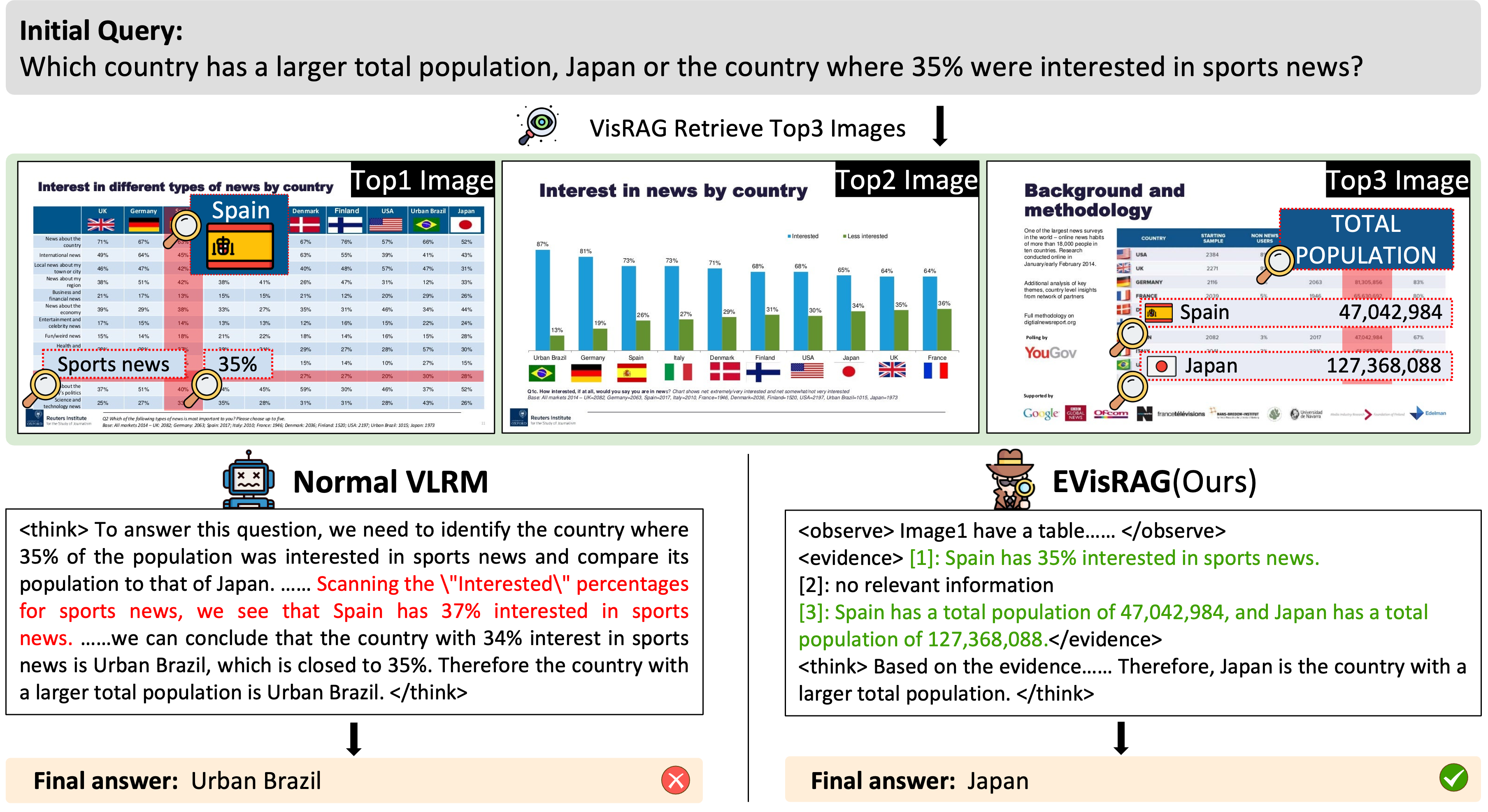 EVisRAG (VisRAG 2.0) 是一种证据引导的视觉检索增强生成框架,它通过首先对检索到的图像进行语言观察以收集每张图像的证据,然后基于这些线索进行推理来回答问题,从而赋予视觉语言模型(VLM)处理多图像问题的能力。EVisRAG 使用奖励范围内的GRPO进行训练,通过应用细粒度的token级别奖励来联合优化视觉感知和推理能力。