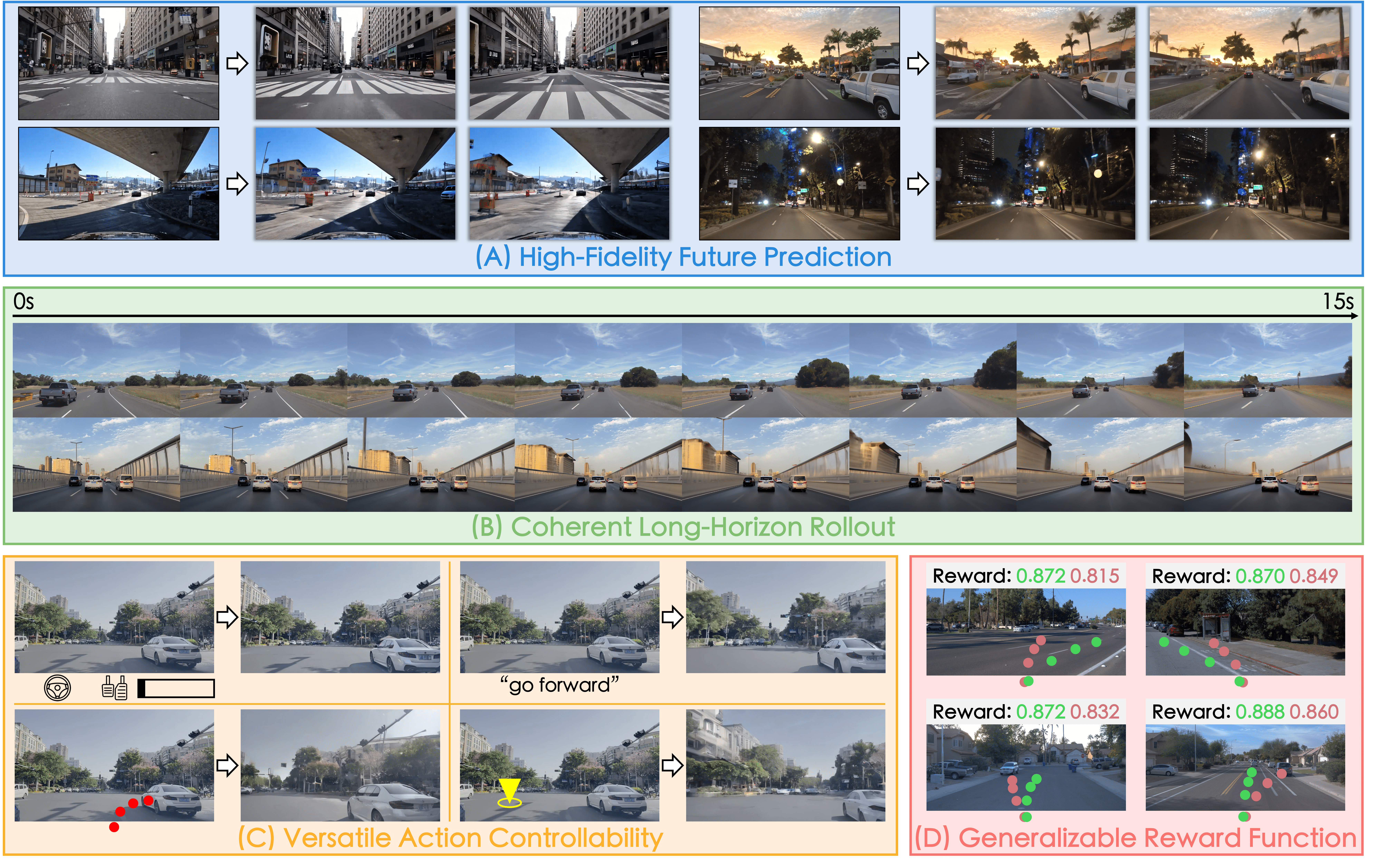 该模型不仅支持连续且长期的轨迹预测,还具备极强的可控性,允许用户通过转向角、速度、自然语言指令、规划轨迹甚至目标点等多种模态来干预和引导生成的未来场景。此外,Vista 还能在不依赖真实标注数据的情况下,为不同的驾驶动作提供奖励信号,极大降低了强化学习训练的成本与门槛。