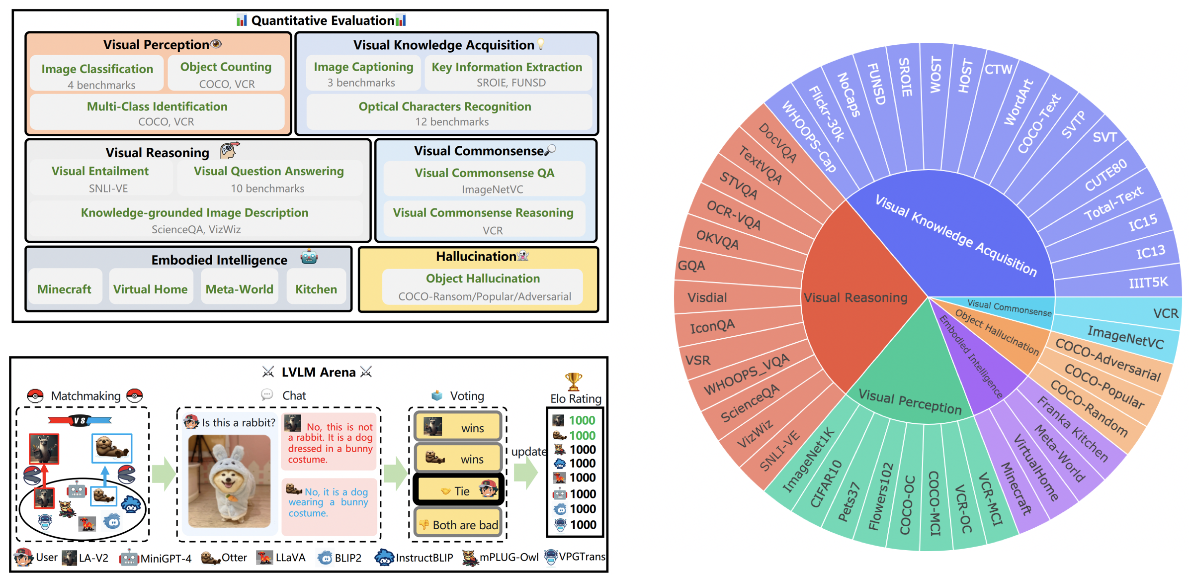 我们衷心感谢ChatBot Arena团队及其论文《Judging LLM-as-a-judge》(arXiv:2306.05685),他们的工作对我们开展LVLM评估提供了重要启发。同时,我们也向LVLM的提供者们致以诚挚的谢意,正是他们的宝贵贡献推动了大型视觉语言模型的发展与进步。最后,感谢为我们LVLM-eHub所用数据集提供方的支持。