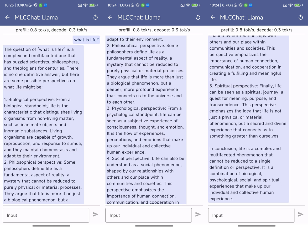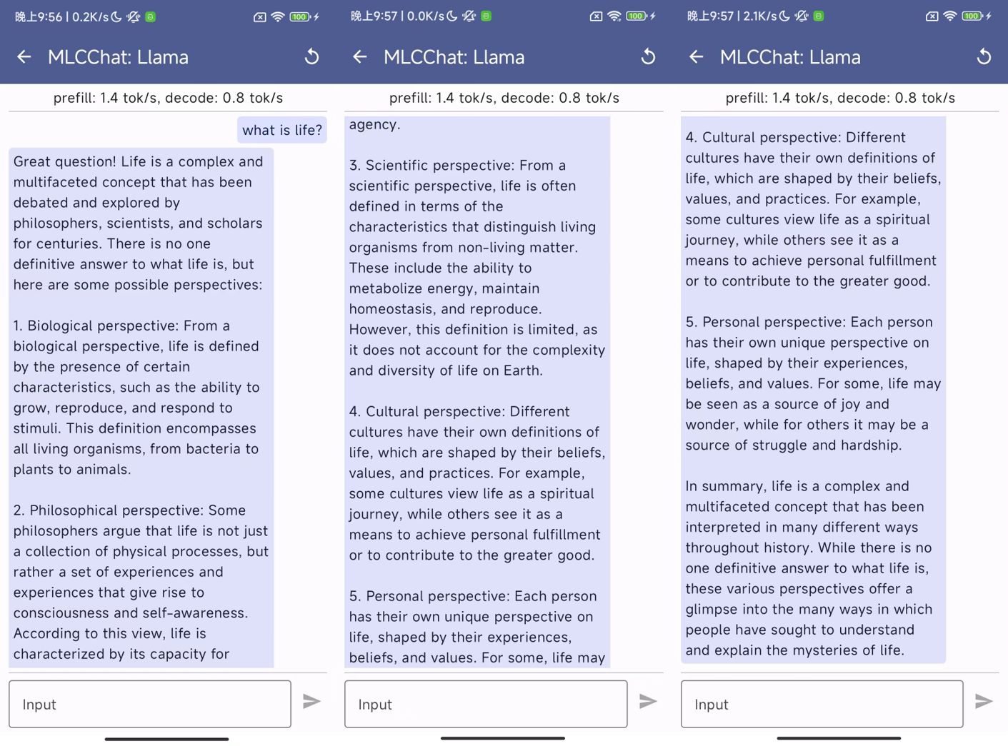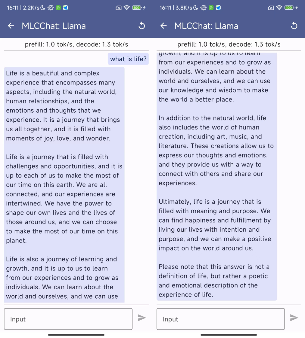 该应用包含三个模型:LLaMa-2-7B-Chat-Omniquant-W3A16g128asym、LLaMa-2-13B-Chat-Omniquant-W3A16g128asym 和 LLaMa-2-13B-Chat-Omniquant-W2A16g128asym。它们分别需要至少 4.5G、7.5G 和 6.0G 的可用内存。请注意,根据我们的论文结果,2 位量化的效果不如 3 位量化。之所以包含 2 位量化,只是对在手机上部署大语言模型的一种极端探索。目前,该应用仍处于演示阶段,响应可能会稍慢,请耐心等待回复。我们已在 Redmi Note 12 Turbo(骁龙 7+ Gen 2,16G RAM)上测试过该应用,部分示例如下: