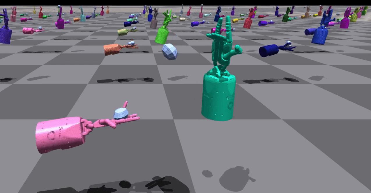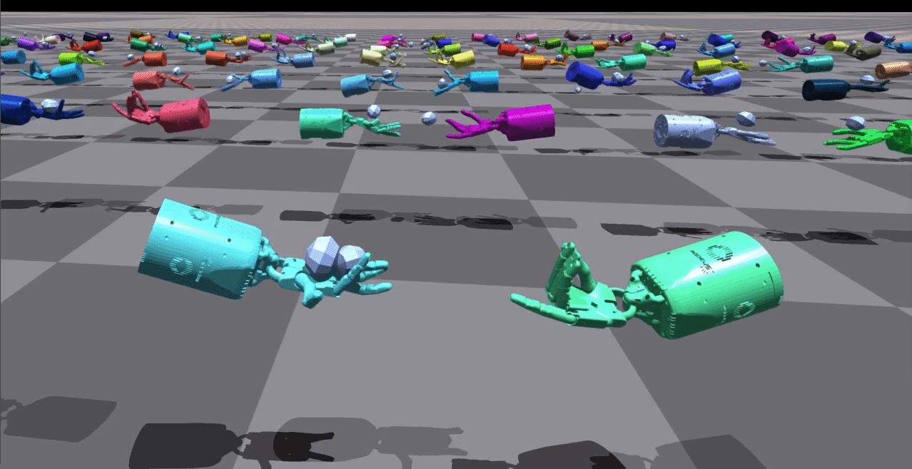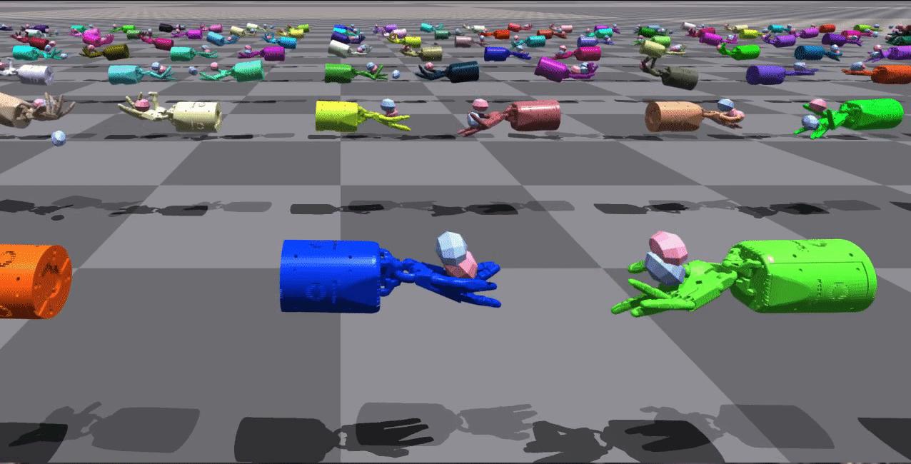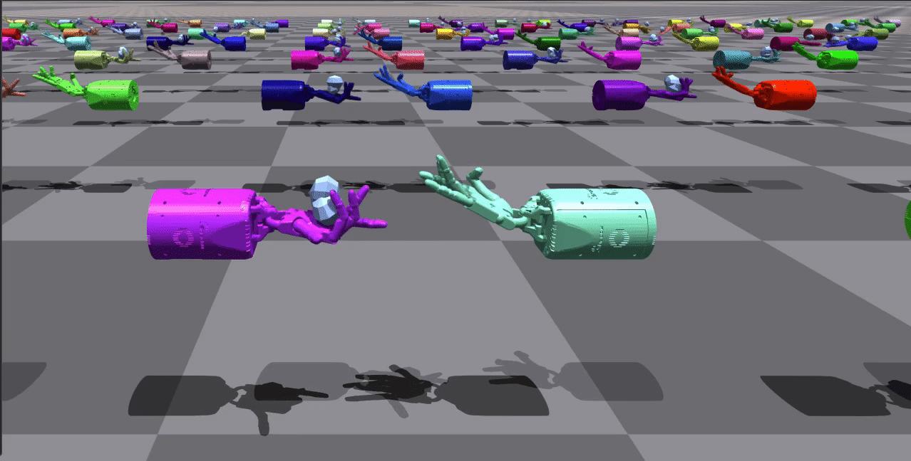 | ShadowHand 双人腋下接球 | 这些环境要求两只手协同配合,将两个物体在手中来回抛掷(即交换位置)。 | ![]() |