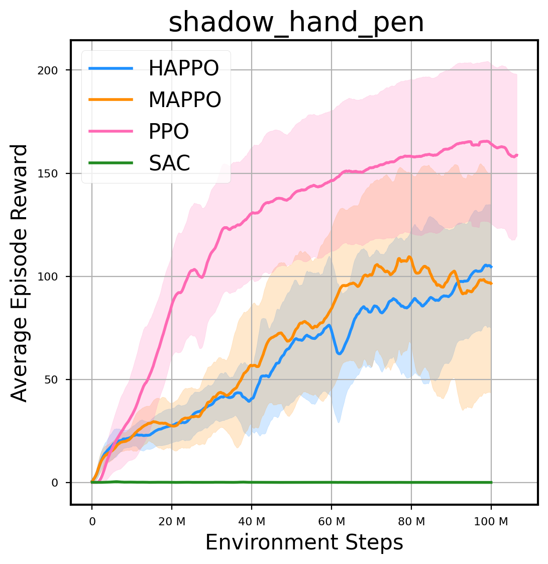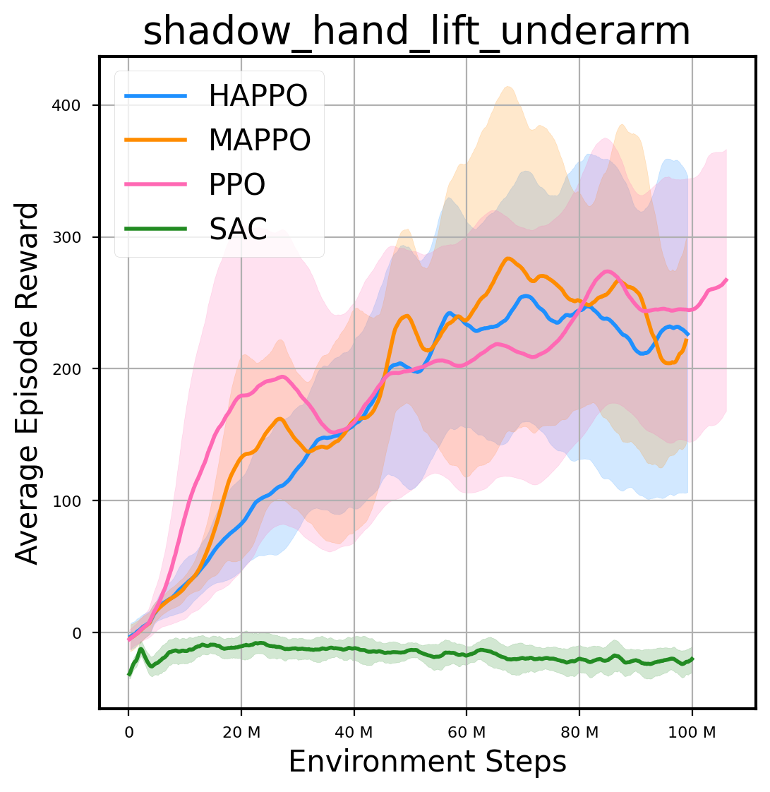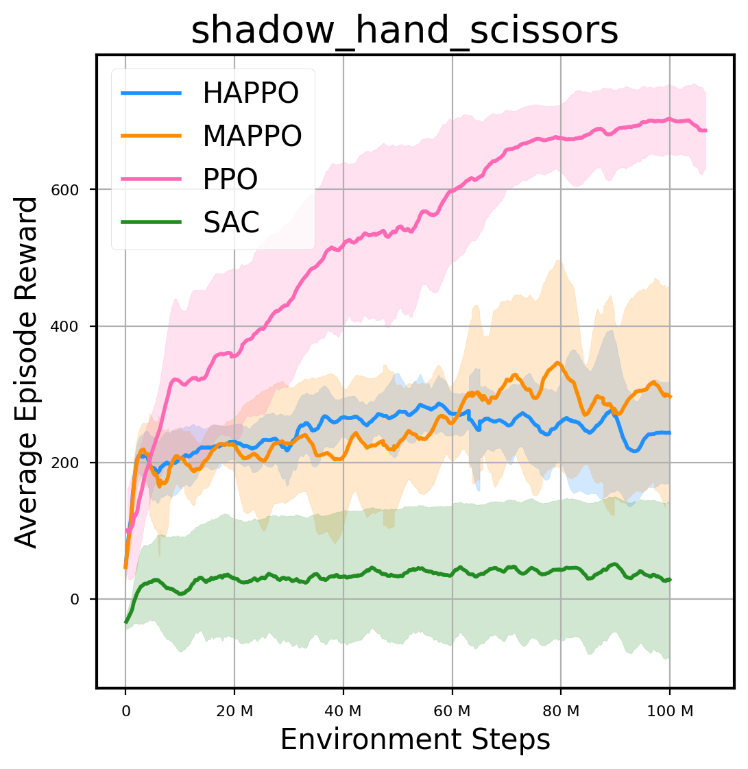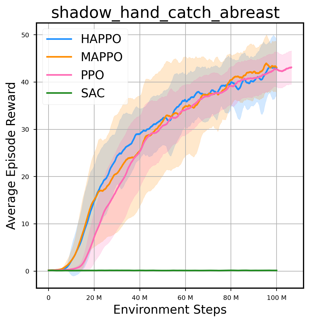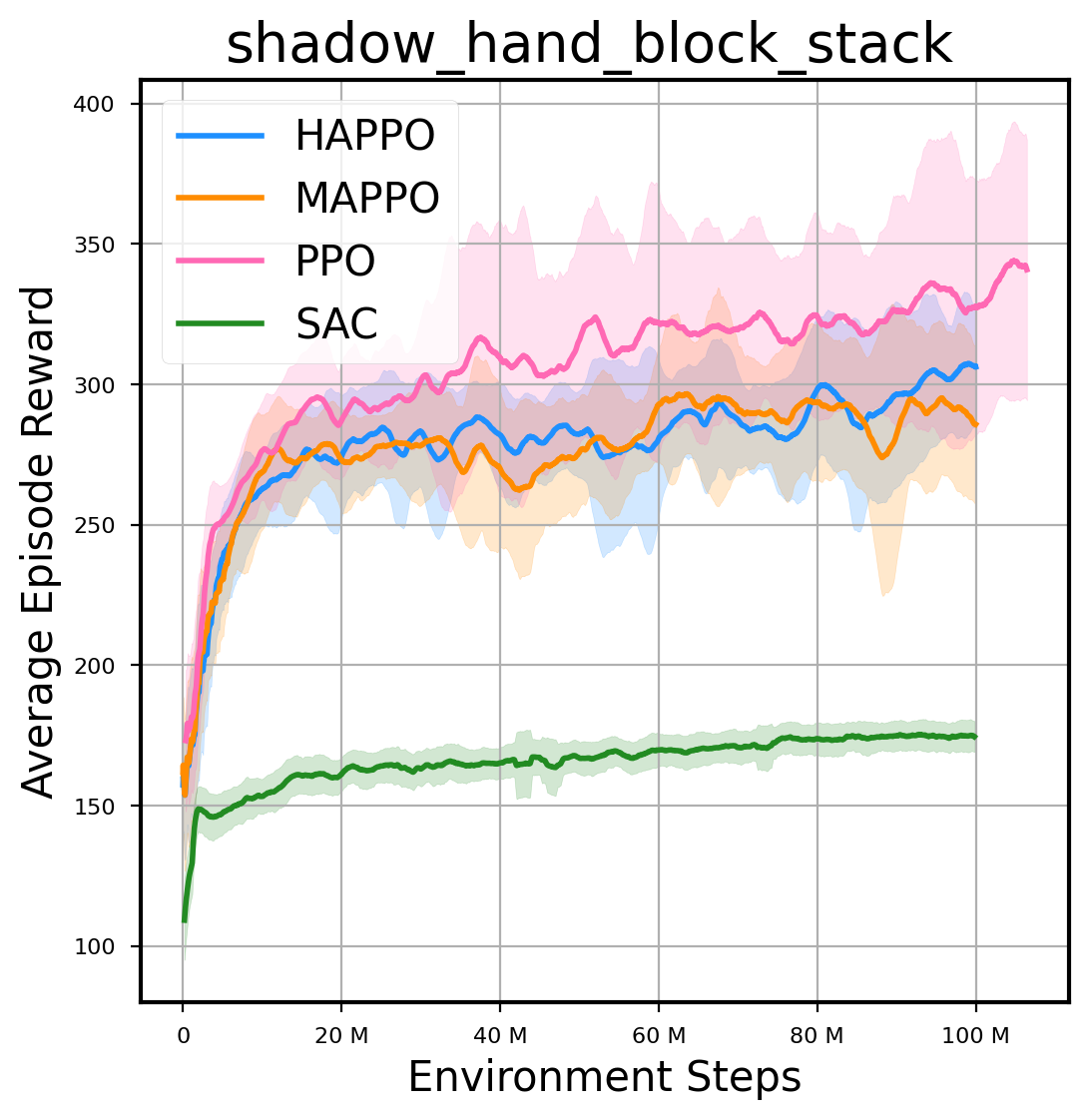 我们提供了由 PPO、HAPPO、MAPPO、SAC 算法运行的稳定且可复现的基准测试结果。所有基准测试均在 2048 num_env 和 100M total_step 的参数设置下运行。dataset 文件夹中包含了原始的 CSV 文件。