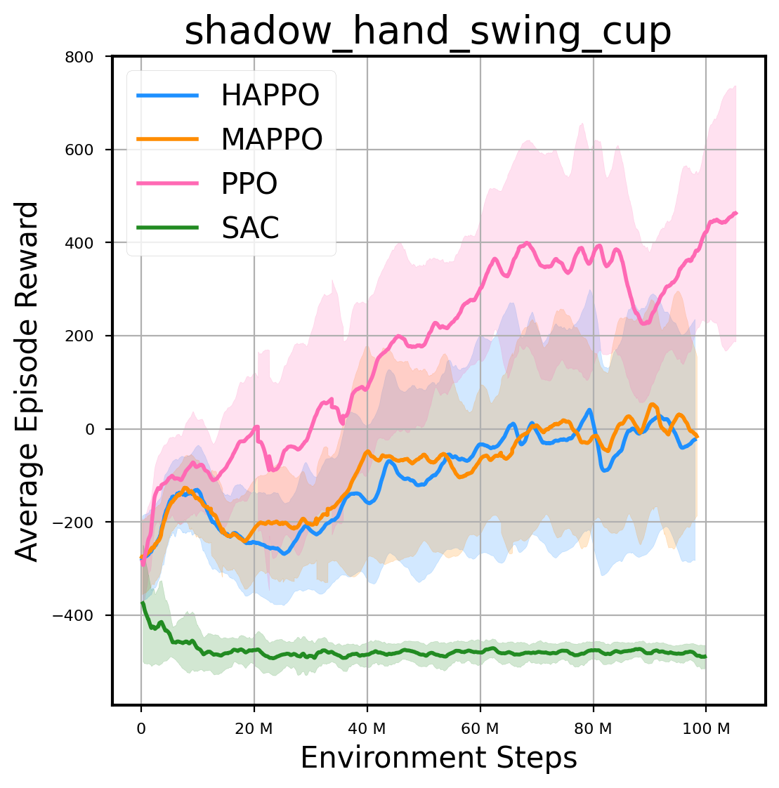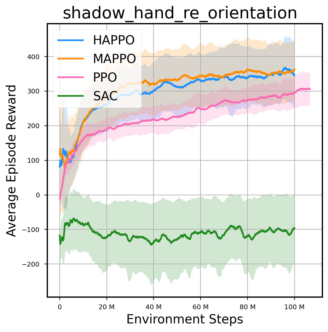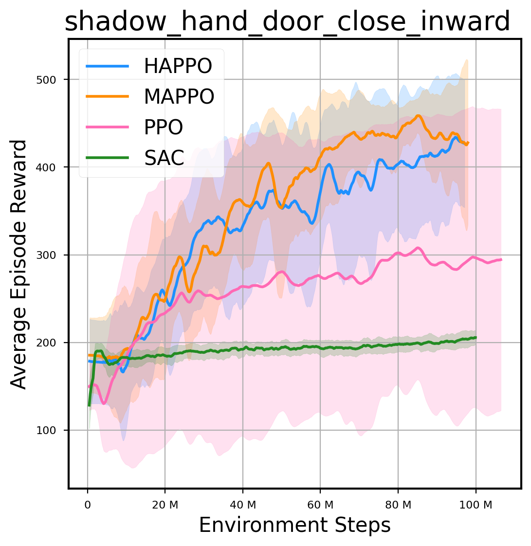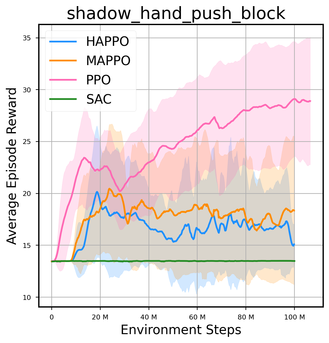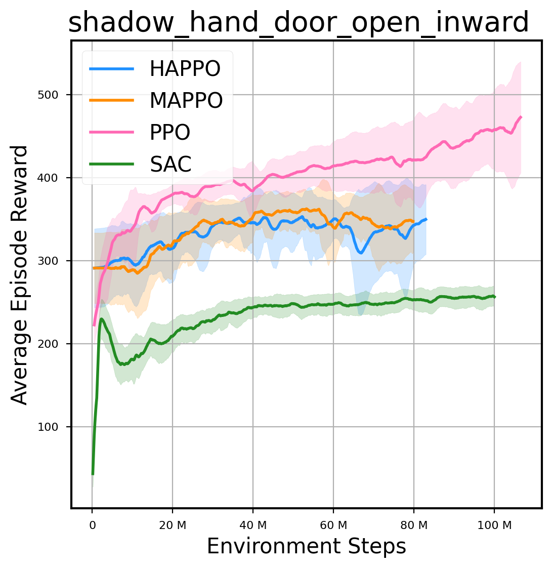 我们提供了由 PPO、HAPPO、MAPPO、SAC 算法运行的稳定且可复现的基准测试结果。所有基准测试均在 2048 num_env 和 100M total_step 的参数设置下运行。dataset 文件夹中包含了原始的 CSV 文件。