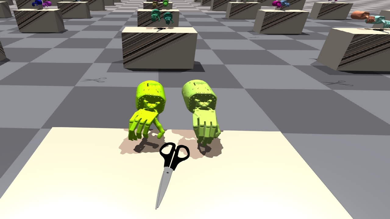 | ShadowHand 打开剪刀 | 该环境要求两只手协同合作,打开一把剪刀。 | ![]() |