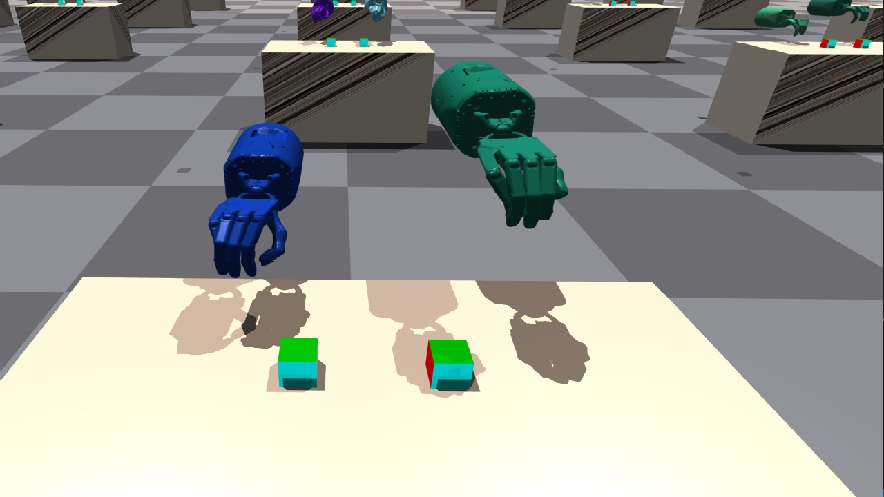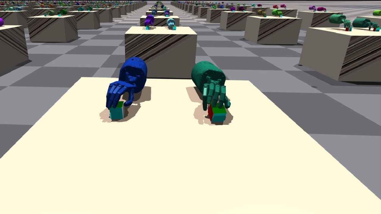 | ShadowHand 并排接球 | 该环境与 ShadowHandCatchUnderarm 类似,不同之处在于两只手的位置从相对变为并排。 | ![]() |