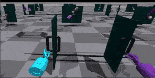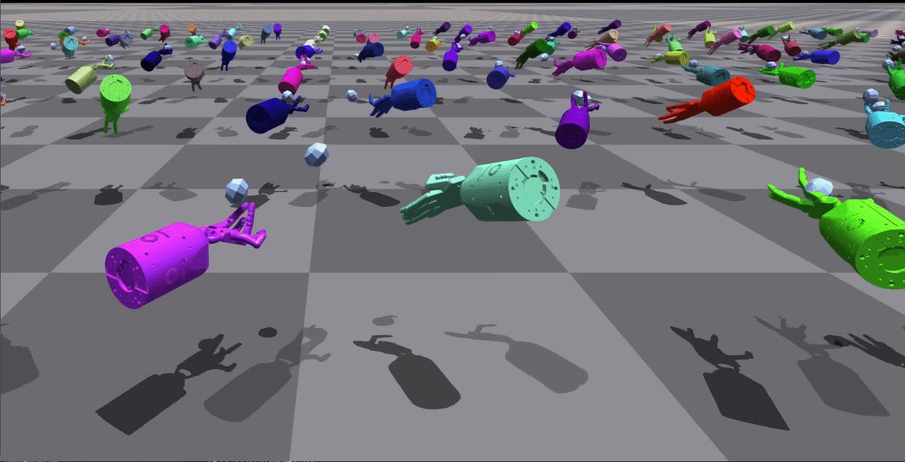 | ShadowHand 腋下接球 | 这些环境同样包含两只机械手,但它们现在具有额外的自由度,可以在一定范围内平移或旋转其质心。 | ![]() |