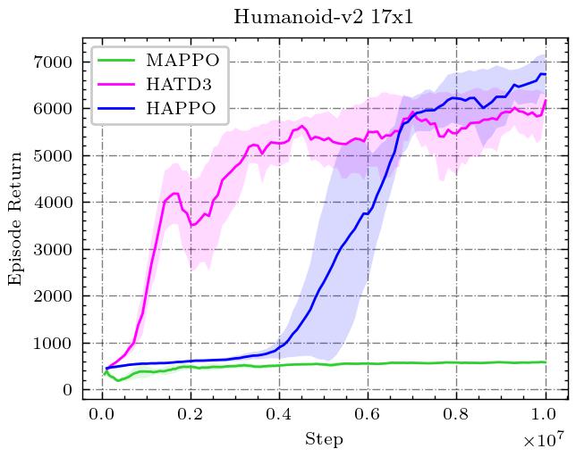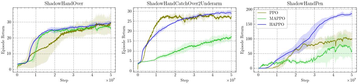 HAPPO 始终优于 MAPPO,同时也优于单智能体基线 PPO,并且表现出更低的方差。
