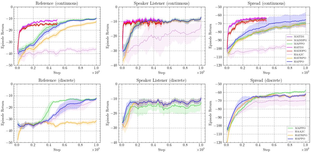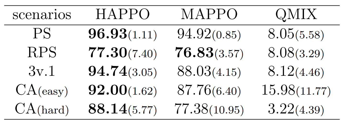 HAPPO、HADDPG 和 HATD3 的表现优于 MAPPO、MADDPG 和 MATD3;其中,HAPPO 和 HATD3 是处理异构智能体合作任务最有效的方法。