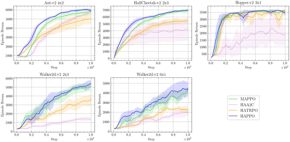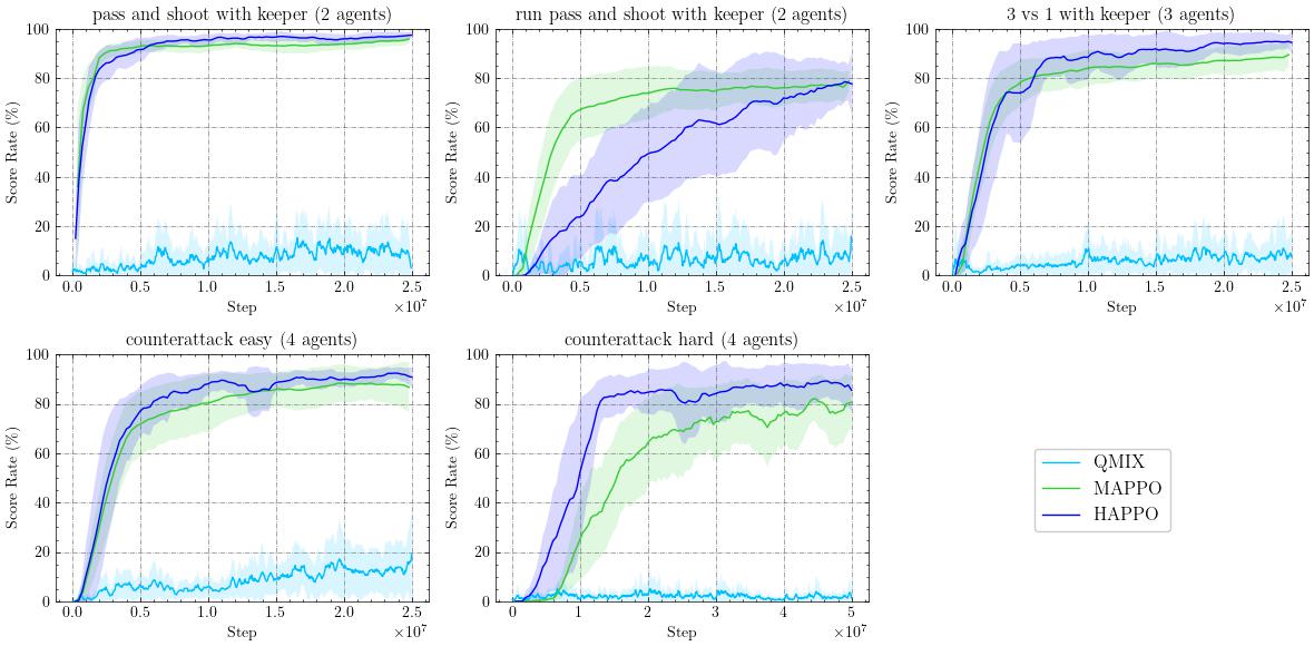 - 无论是基于策略梯度的算法还是基于值函数的算法,例如分别以 HAPPO 和 HASAC 为代表的算法,在广泛的基准测试中均表现出优越的性能。