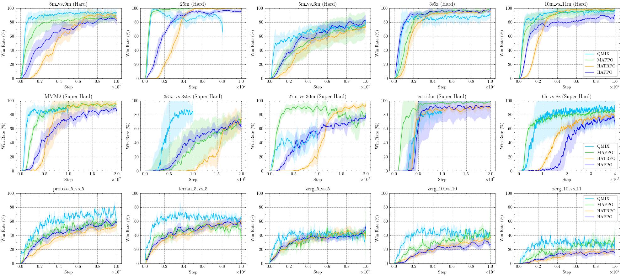 HAPPO 和 HATRPO 在 SMAC 和 SMACv2 中的表现与 MAPPO 和 QMIX 不相上下甚至更好,这表明它们在以同质智能体为主的场景中具有很强的能力。