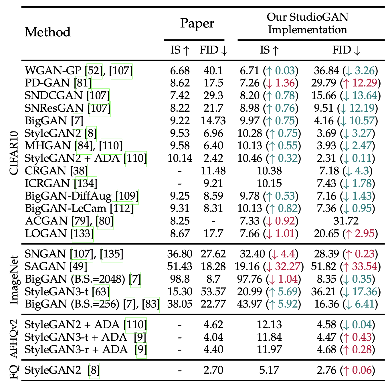 - StudioGAN 提供 wandb 日志和预训练模型(即将就绪)。