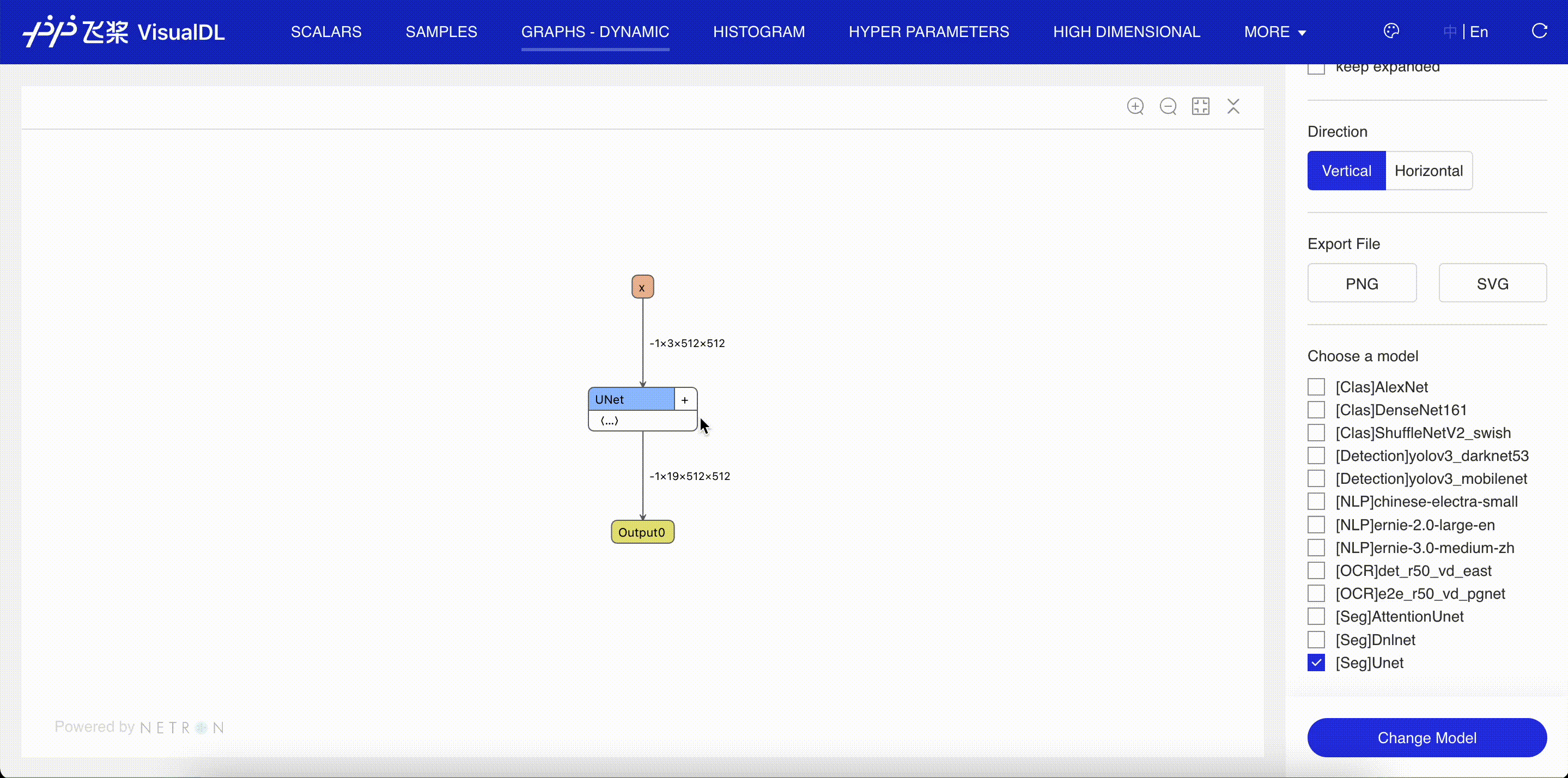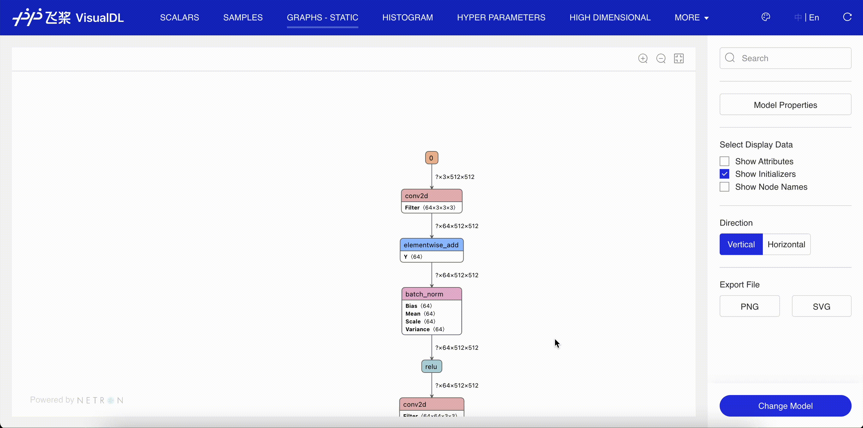 VisualDL 的图形功能由 Netron 提供支持,是一个由 PaddlePaddle 和 ECharts 支持的开源项目。我们热烈欢迎开发者使用、评论和贡献。