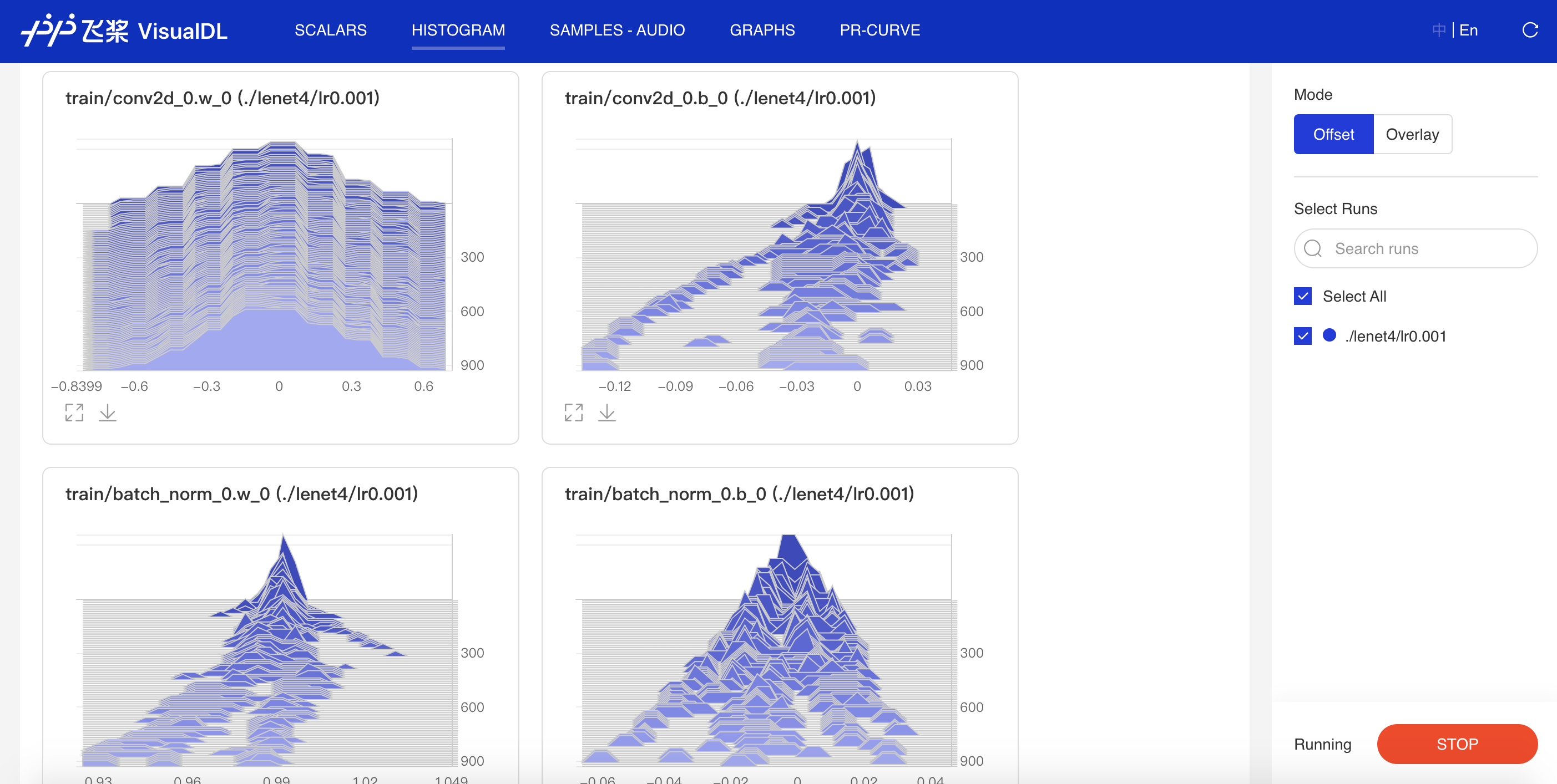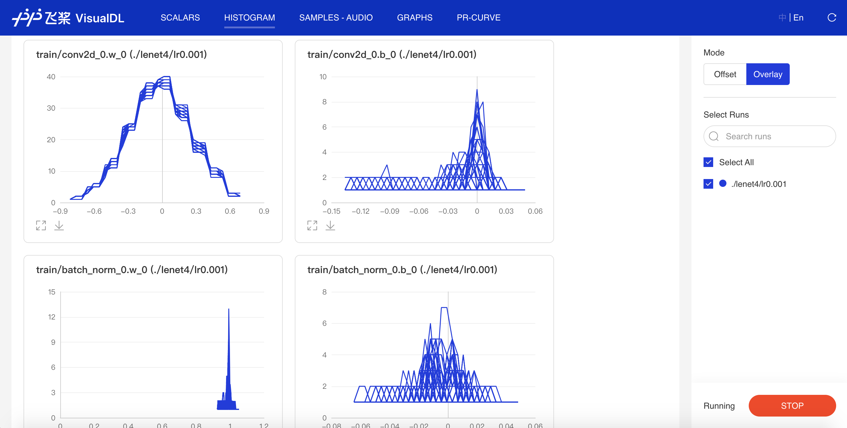 启动 VisualDL Board 后,LogReader 会持续记录数据并在前端显示。因此,参数的变化可以实时可视化,如下所示: