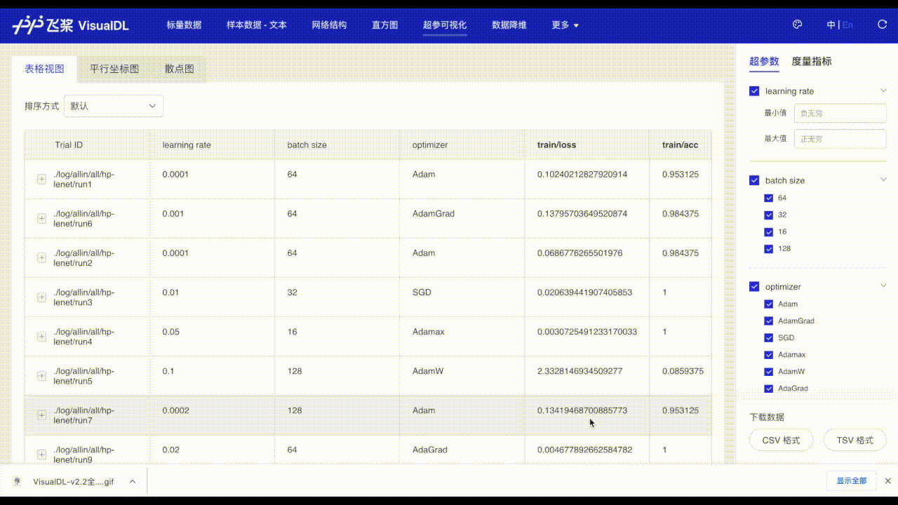 超参数 以丰富的视图可视化超参数与模型指标(如准确率和损失)之间的关系,帮助您高效地识别最佳超参数。