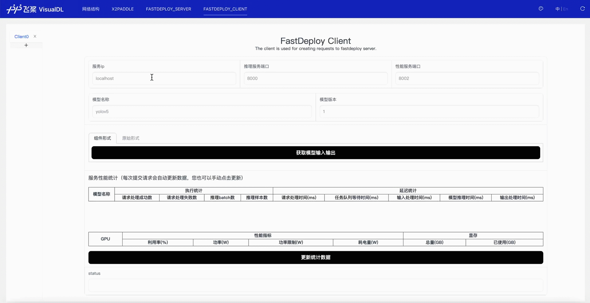FastDeployClient 组件主要用于快速访问 FastDeployServer 服务,帮助用户可视化预测请求和结果。请参阅 使用 VisualDL 作为 FastDeploy 客户端进行请求可视化。