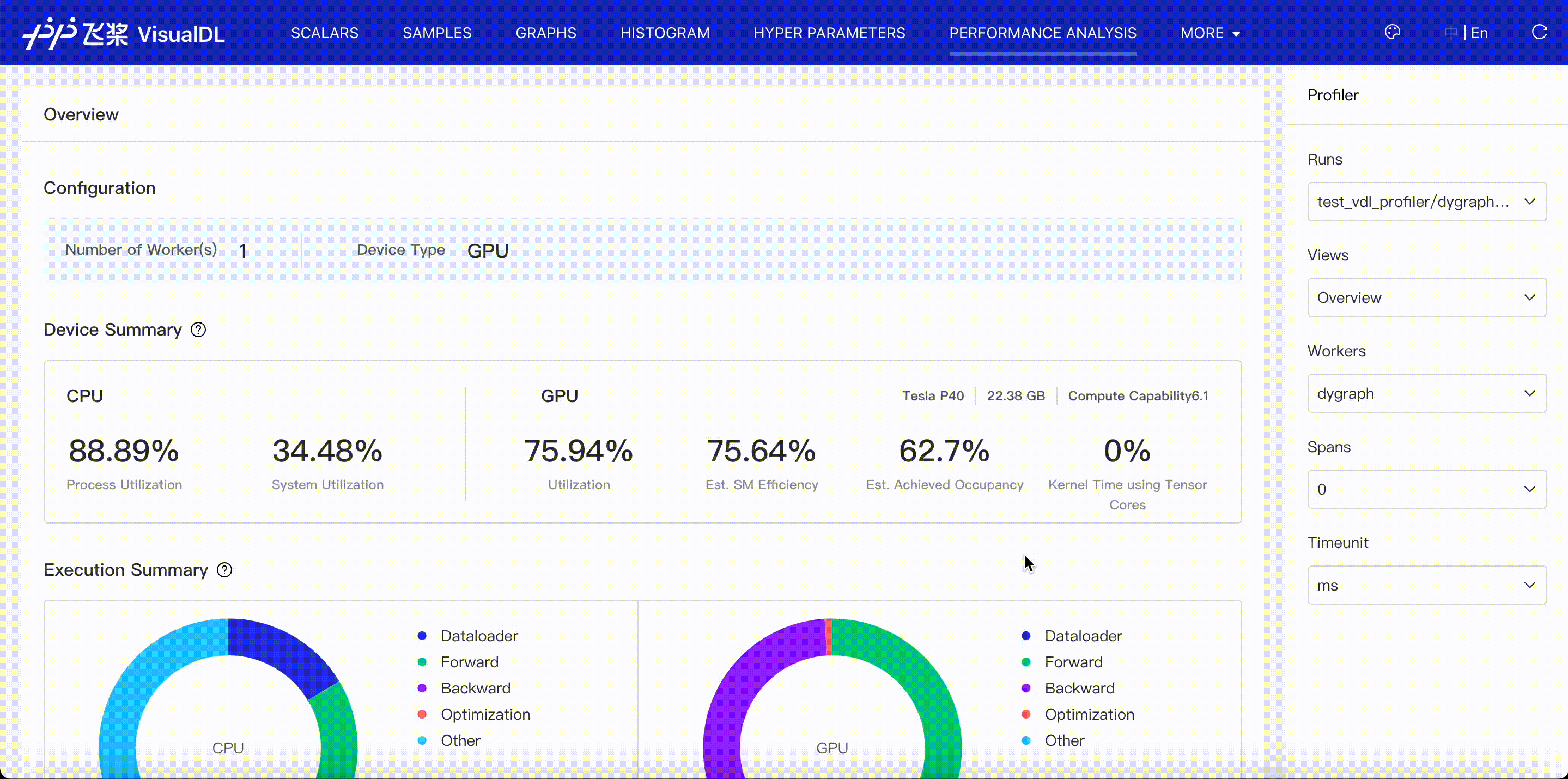 性能分析(Profiler)可视化程序运行期间收集的剖析数据,帮助您识别程序瓶颈并优化性能。请参阅 VisualDL Profiler 指南。