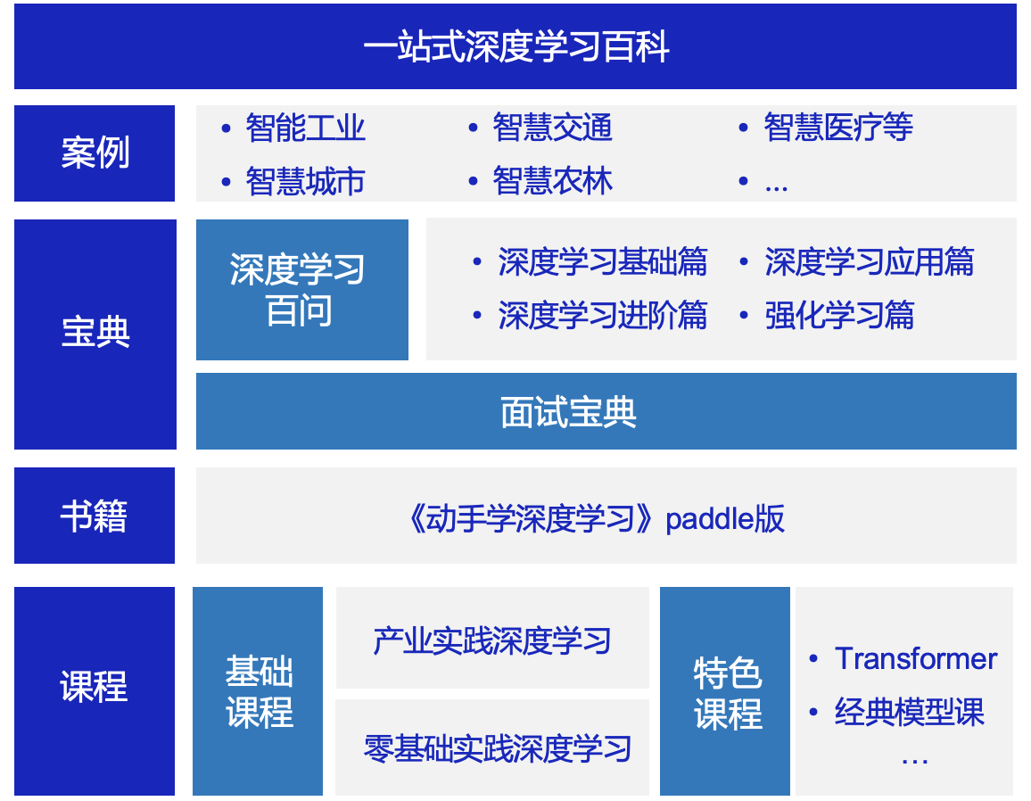 从理论到实践,从科研到产业应用,各类学习材料一应俱全,旨在帮助开发者高效地学习和掌握深度学习知识,快速成为AI跨界人才。