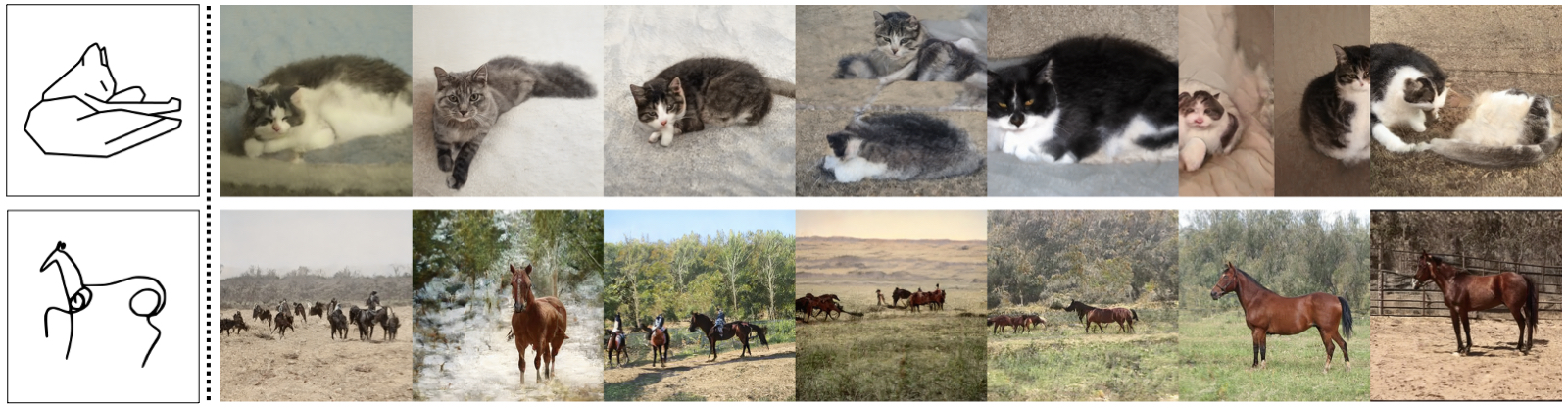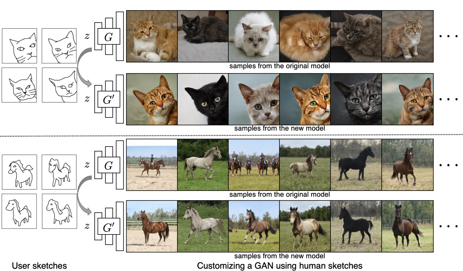 我们的方法接受一张或多张手绘草图,并将现成的 GAN 进行定制,以匹配输入的草图。尽管我们的新模型会改变物体的形状和姿态,但颜色、纹理、背景等其他视觉线索在修改后仍会被忠实地保留。