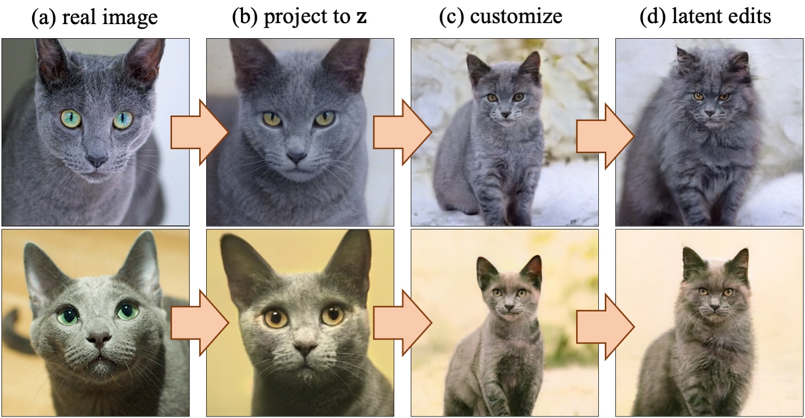 使用我们定制的模型进行图像编辑。 给定一张真实图像 (a),我们使用 Huh et al. 将其投影到原始模型的潜在空间 z 中 (b)。然后,我们将投影得到的 z 输入到我们基于草图训练的站立猫模型中 (c)。最后,我们使用 GANSpace 的 添加毛发 操作对图像进行编辑 (d)。