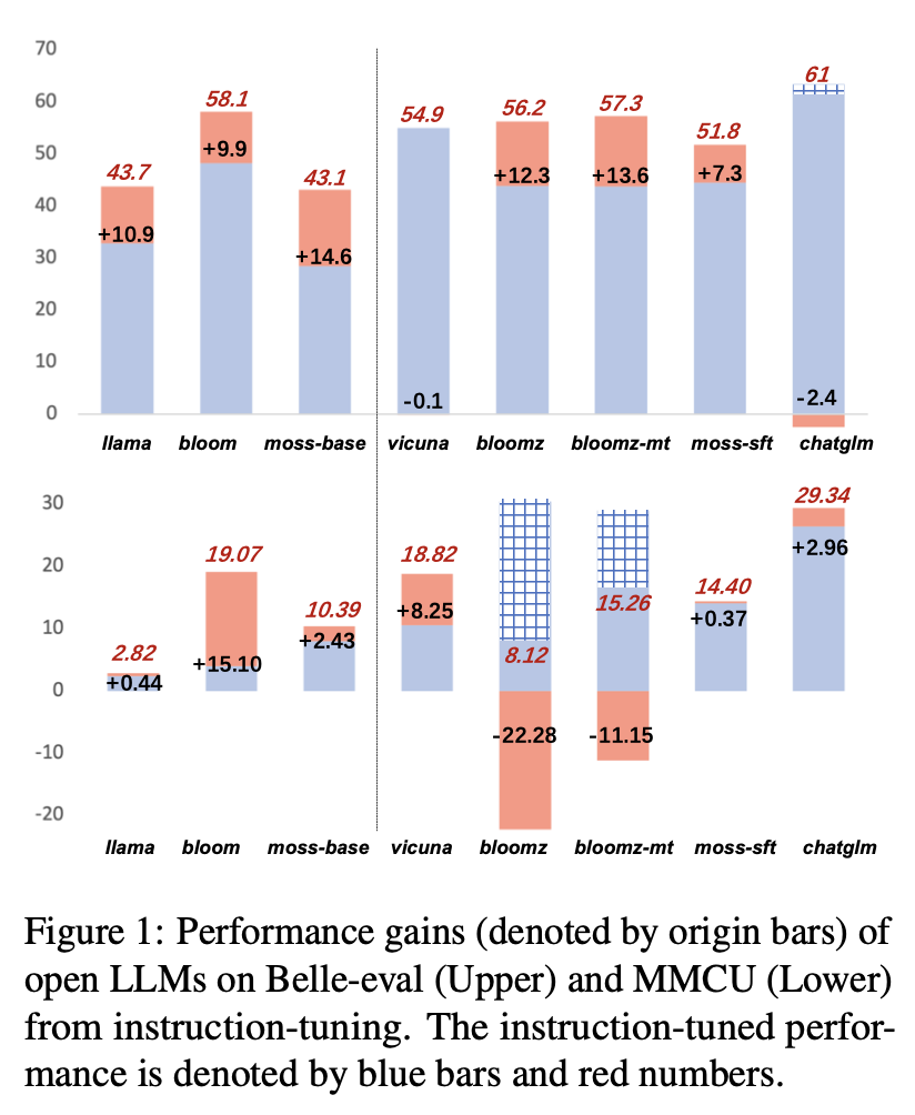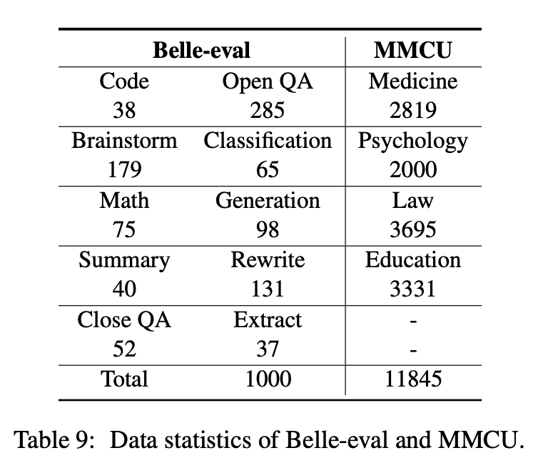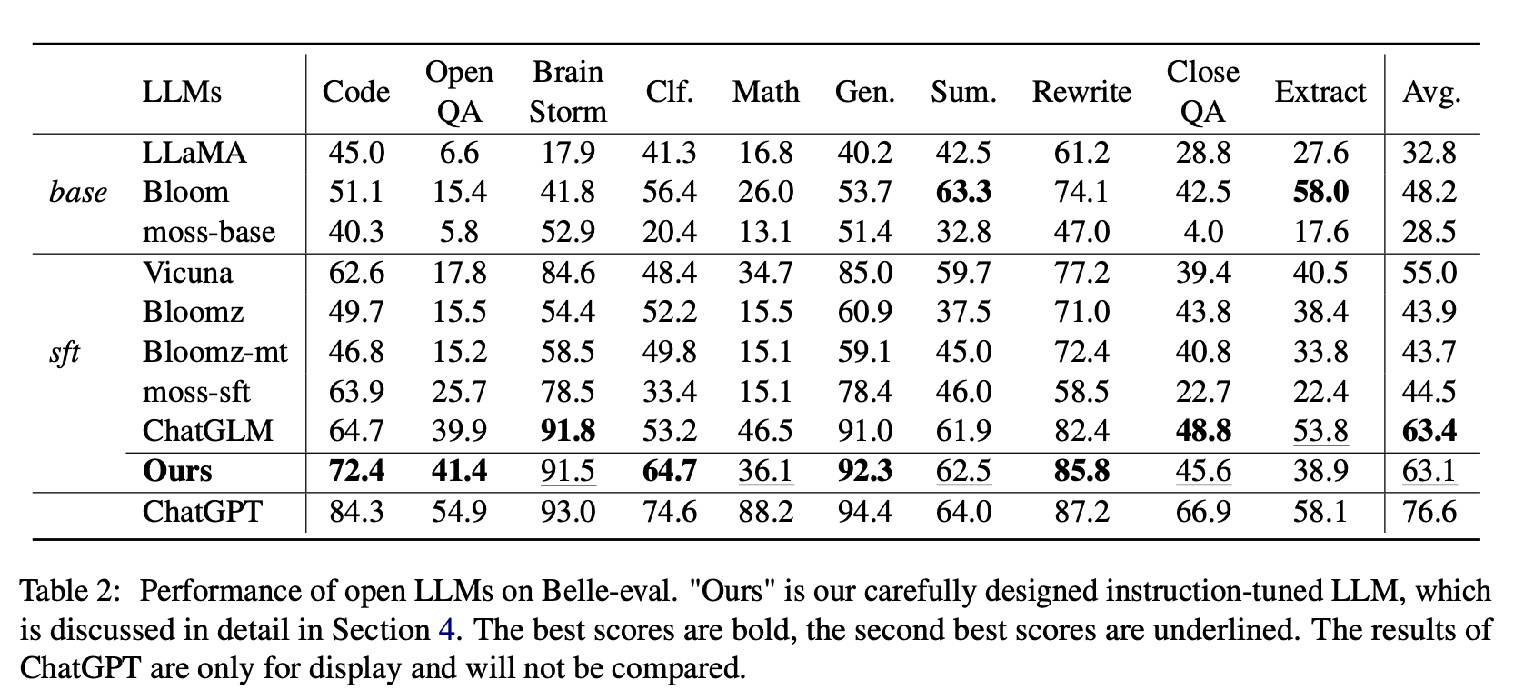 (2) 在这些数据集中,Belle 表现最佳,因其包含的指令数据量最大。然而,以类似方式构建但数据量更多的 moss-sft-data 所训练的模型表现却不理想。