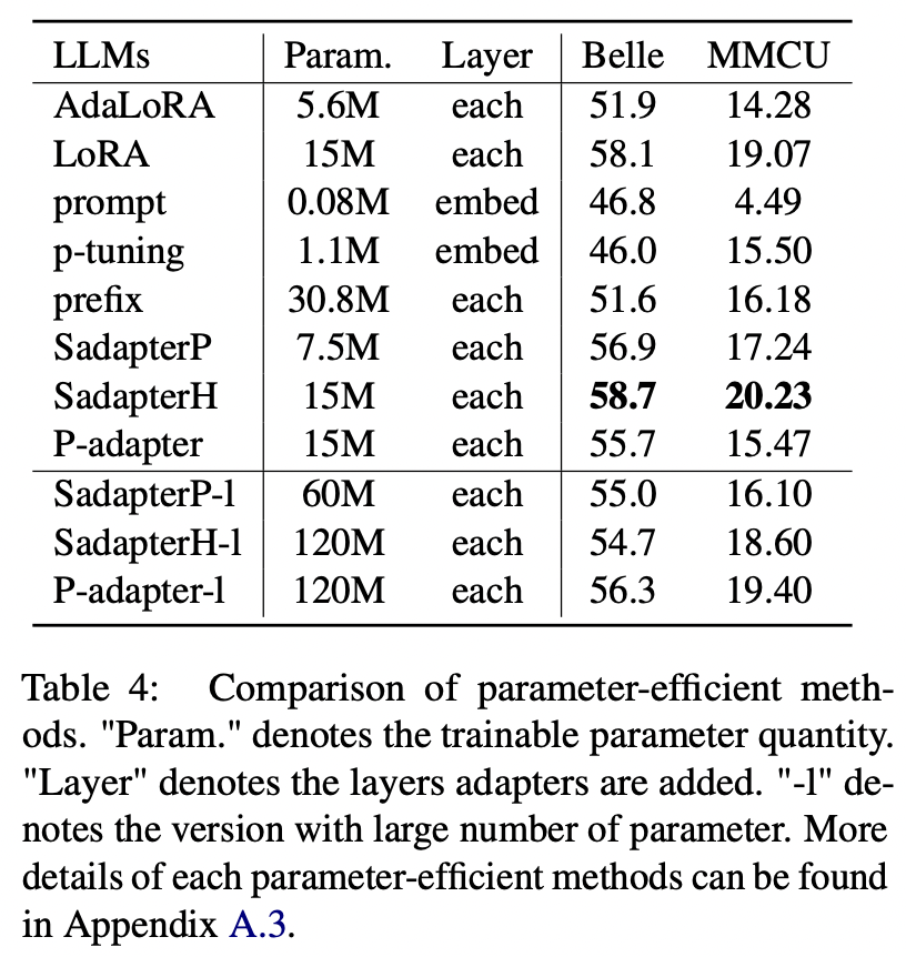 (3) 尽管 AdaLoRA 是 LoRA 的改进版本,但其性能明显下降,可能是因为 LLM 所需的 LoRA 可训练参数量已不适合进一步缩减。