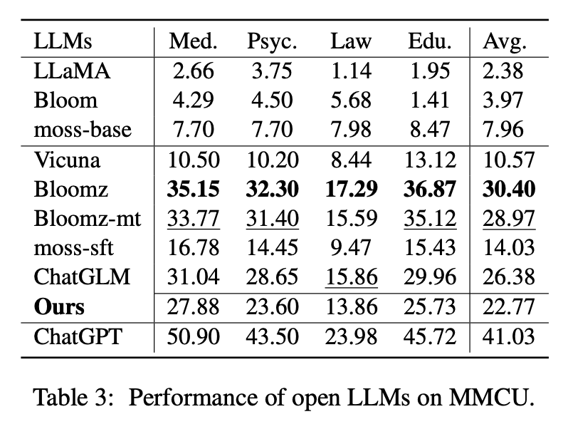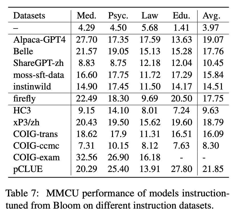 (2) 在上半部分所示的基于 ChatGPT 的数据中,ShareGPT-zh 的表现远低于其他数据集。这可能是因为真实用户很少就学术主题提出多项选择题。