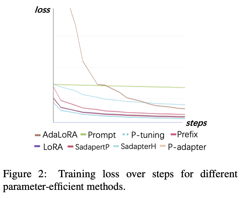 (2) AdaLoRA 的初始损失非常高,因为它需要同时学习参数预算分配(parameter budget allocation),导致模型难以很好地拟合训练数据。