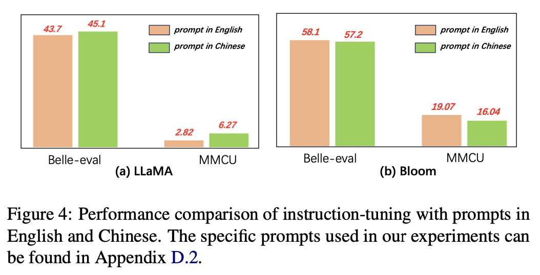 图 4 展示了基于 LLaMA 和 Bloom 使用中文与英文提示的结果。在对 LLaMA 进行指令微调时,使用中文提示相比英文提示在两个基准测试上均能提升性能;而在 Bloom 上则观察到相反的现象。