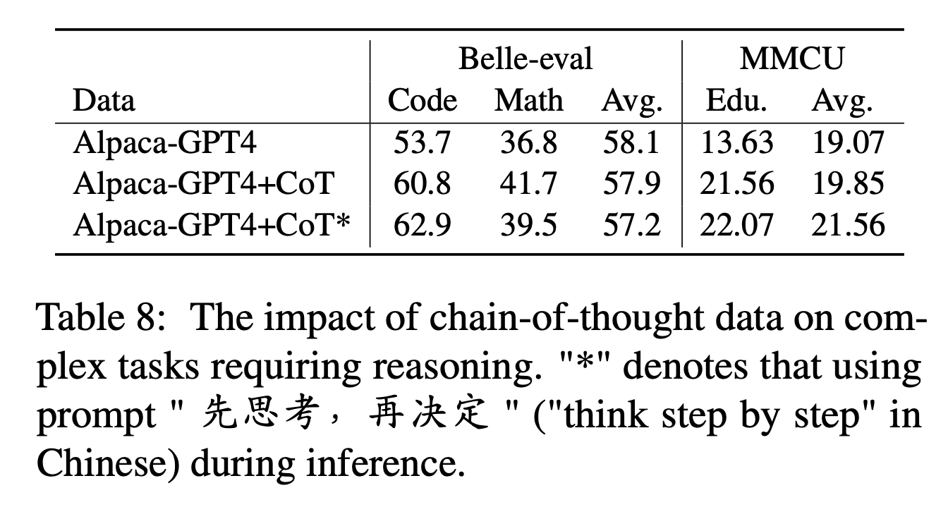 首先,将加入 CoT 数据的方式标记为 “Alpaca-GPT4+CoT”。此外,在每条指令末尾添加一句“先思考,再决定”(即英文中的 "think step by step"),以引导模型基于 CoT 进行回答,并将这种方式标记为 “Alpaca-GPT4+CoT*”。