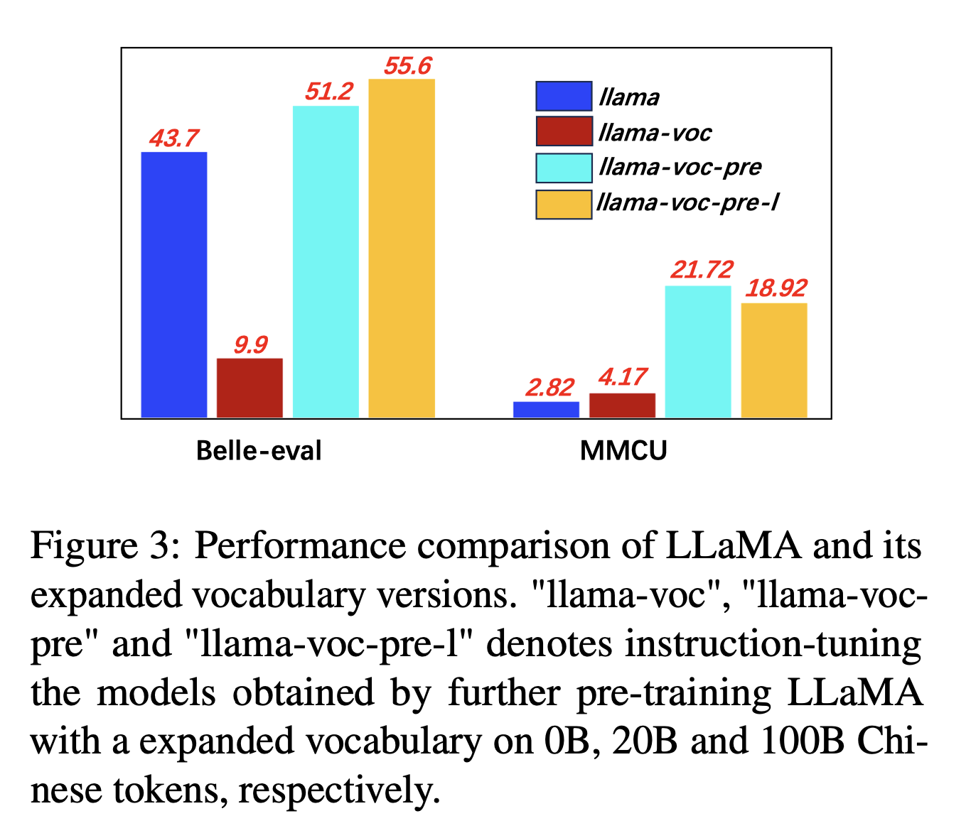 与直觉相反,“llama-voc-pre-l”(100B)在 MMCU 上的表现不如 “llama-voc-pre”(20B),这表明在学术考试任务上,更多的预训练数据未必带来更高的性能。