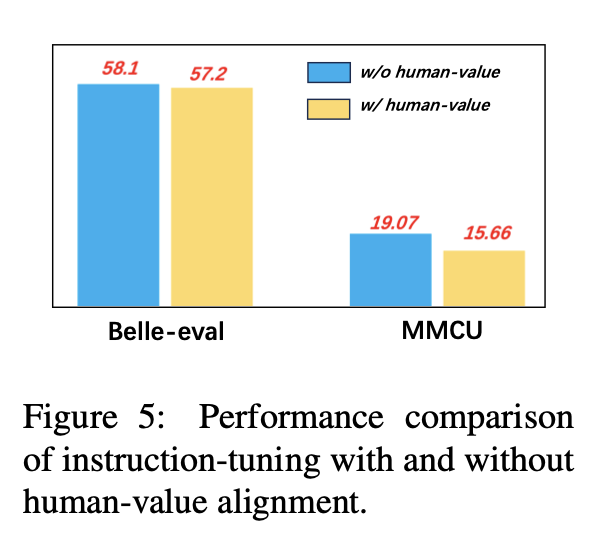 图 5 比较了在指令微调中加入与不加入人类价值观对齐数据的结果。