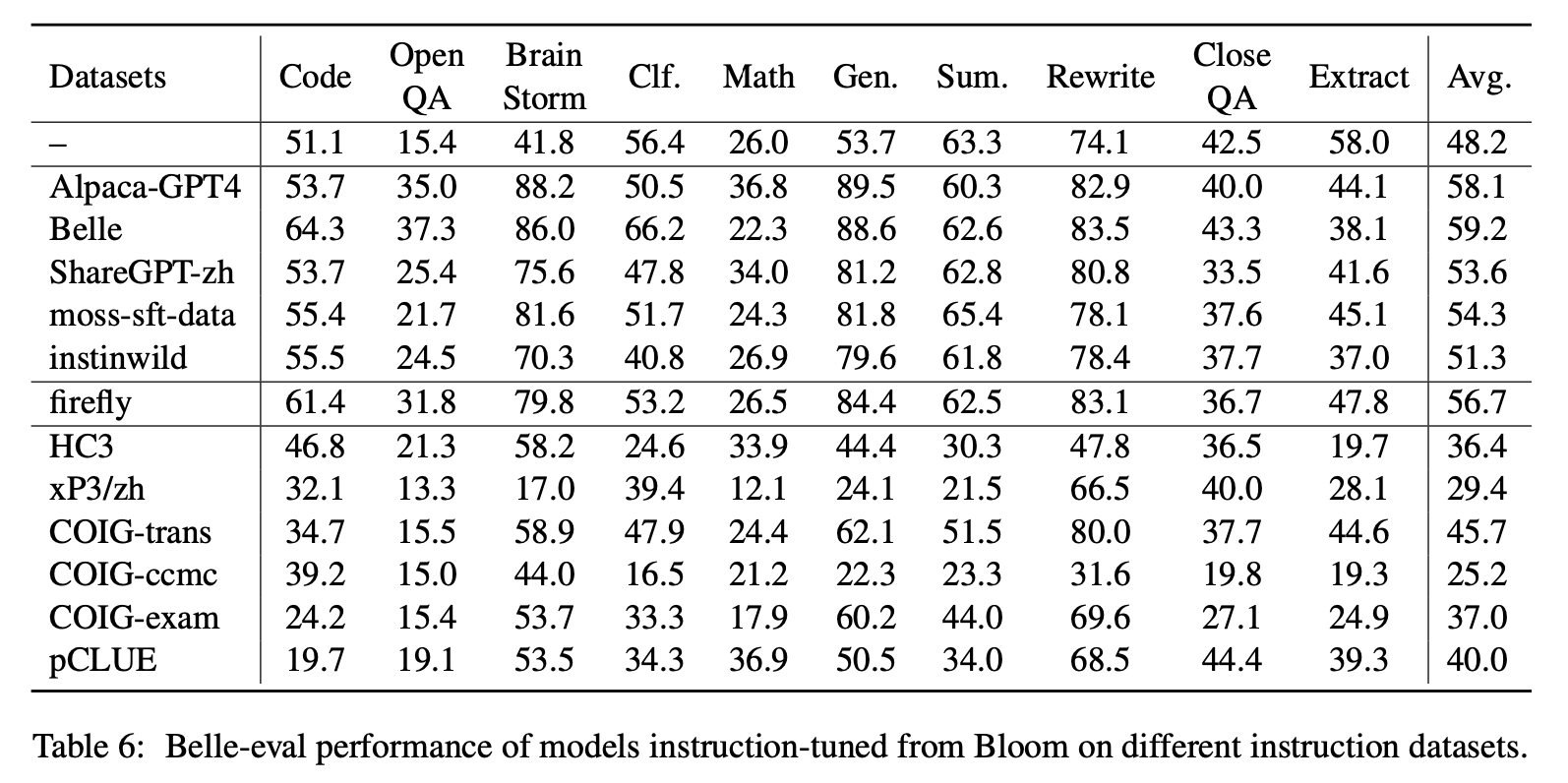 为了研究不同类型中文指令数据集的影响,作者收集了流行的开源中文指令数据(如表 5 所示),并使用 LoRA 对 Bloom 模型进行微调。