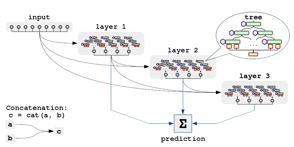 Node 通过构建“神经遗忘决策集成”模型,将深度学习的强大表征能力与决策树的可解释性相结合。其独特的技术亮点在于学习了由可微分的“遗忘决策树”组成的深度集成架构。这种设计不仅保留了决策树对特征分裂的天然优势,还利用端到端的训练方式自动优化树结构,从而在分类和回归任务中实现更精准的预测。
