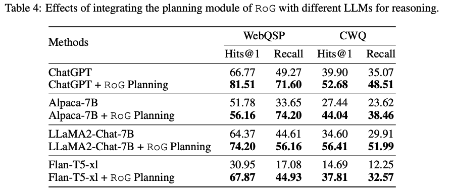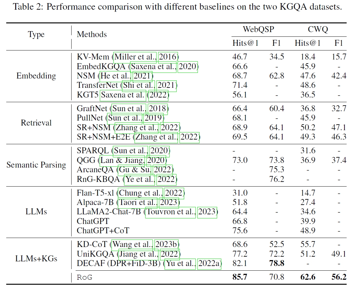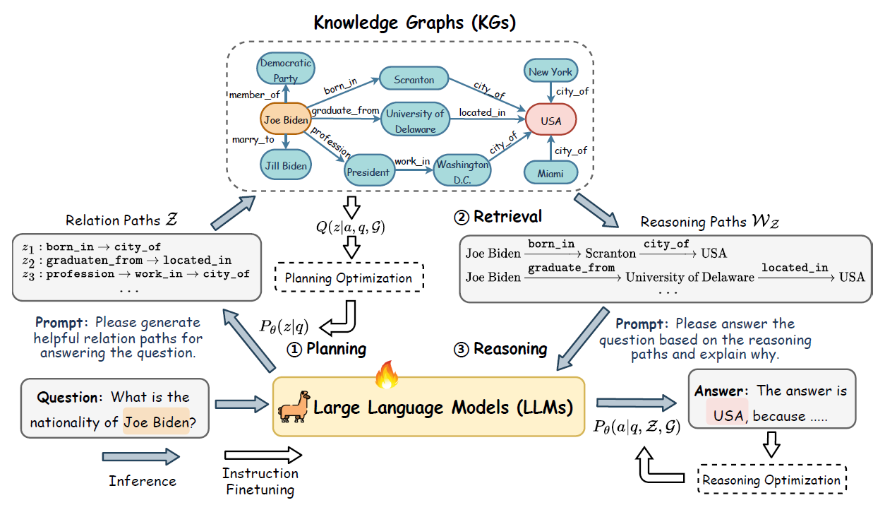 图上推理 (RoG) 将大语言模型与知识图谱相结合,实现忠实且可解释的推理。我们提出了一种规划-检索-推理框架:首先,RoG基于知识图谱生成具有事实依据的关系路径作为忠实的规划;随后,这些规划被用于从知识图谱中检索有效的推理路径,供大语言模型进行忠实推理并生成可解释的结果。