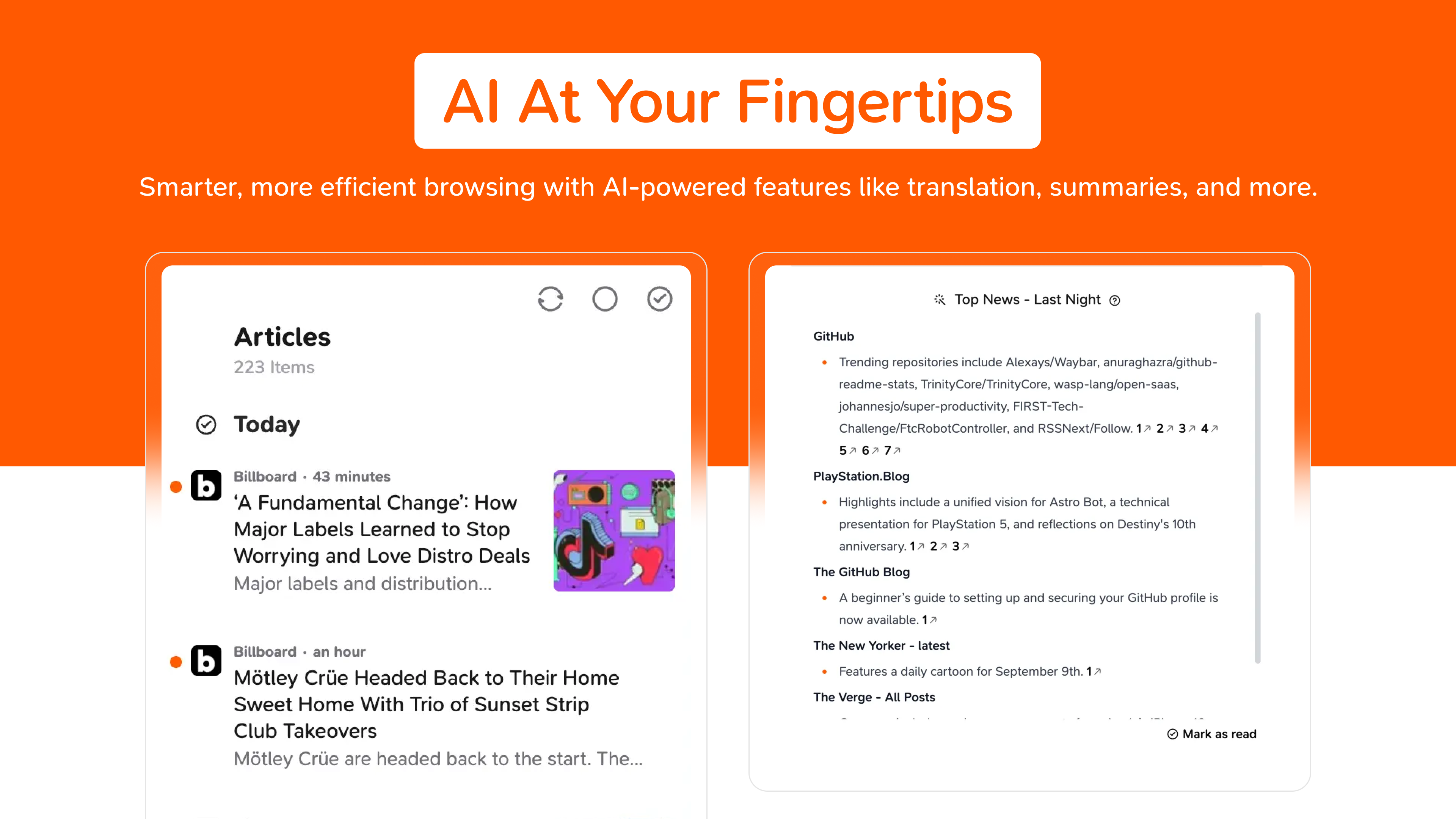 - AI 驱动的高效筛选:借助内置 AI 能力自动生成文章摘要并高亮关键信息,李明能在几分钟内快速筛选出值得深读的内容,决策效率倍增。