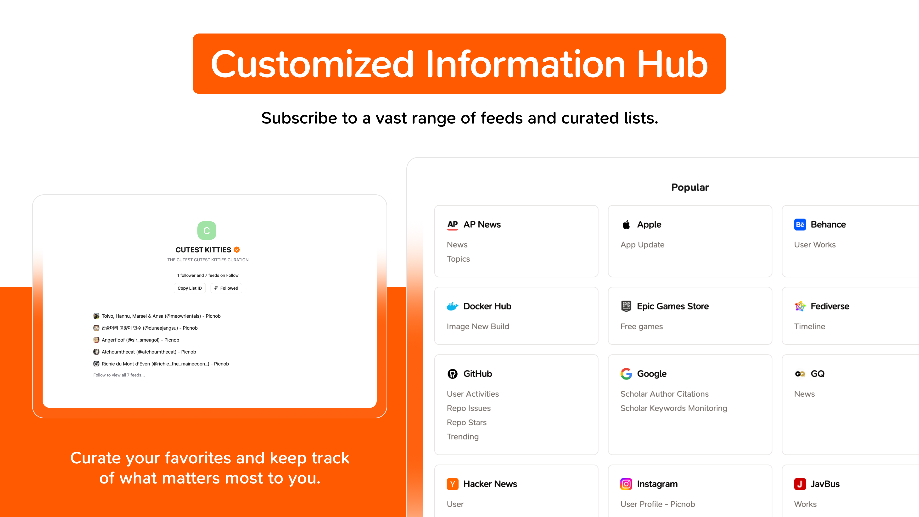 订阅海量资讯源和精选列表。自定义收藏,随时掌握你最关心的内容。