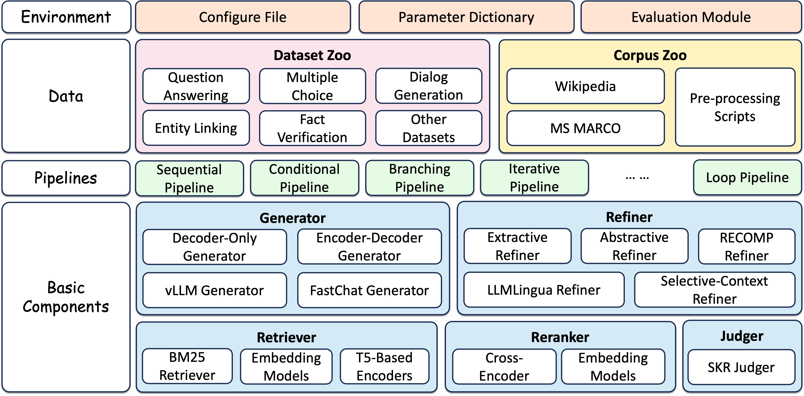 - 组件组装困难:缺乏统一框架,尝试组合不同的检索器、重排序器和生成器时,接口不兼容导致频繁调试,难以快速搭建实验流水线。