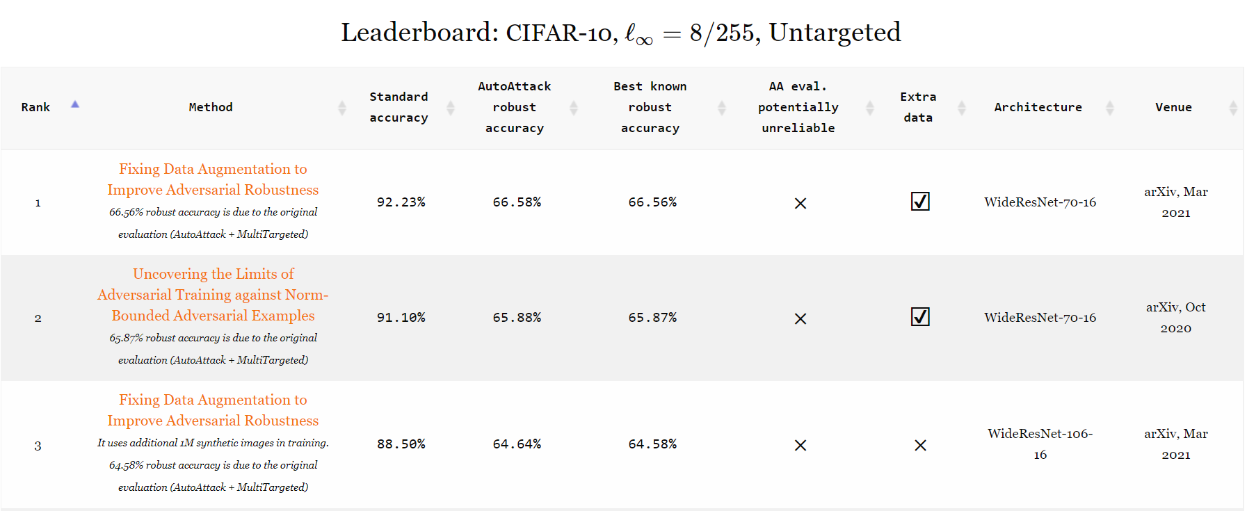 为了防止新防御措施对 AutoAttack 产生潜在的过度适应,我们也欢迎基于自适应攻击 (adaptive attacks) 的外部评估,特别是在 AutoAttack 标记 鲁棒性可能被高估的情况下。对于每个模型,我们关注的是已知的最佳鲁棒准确率,并将 AutoAttack 和自适应攻击视为相互补充。