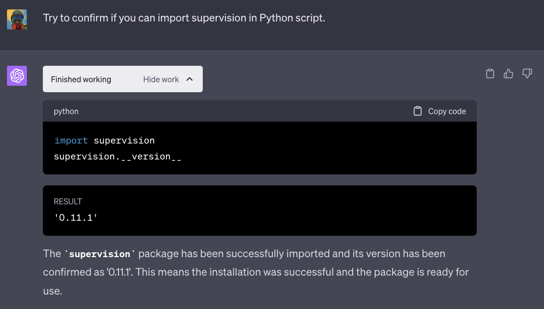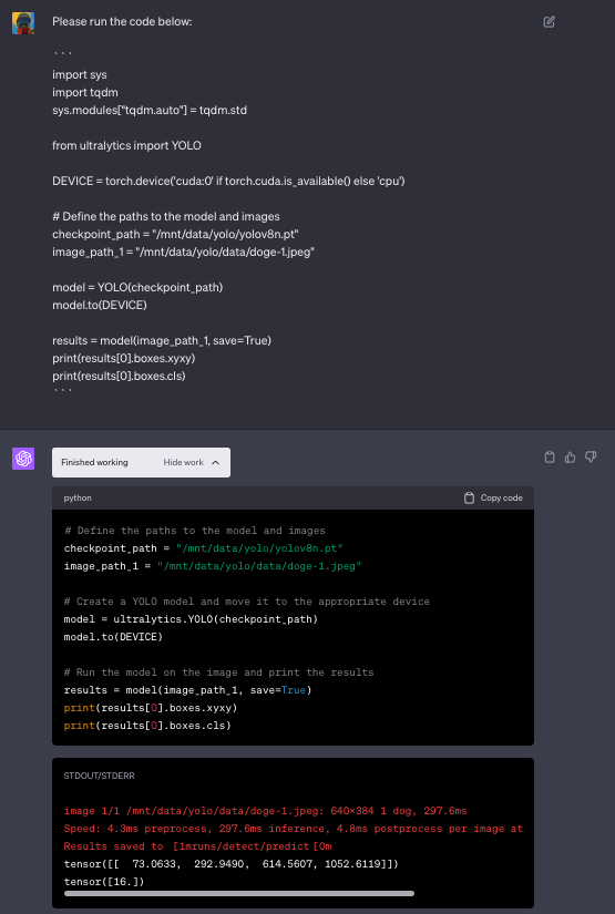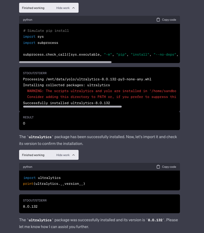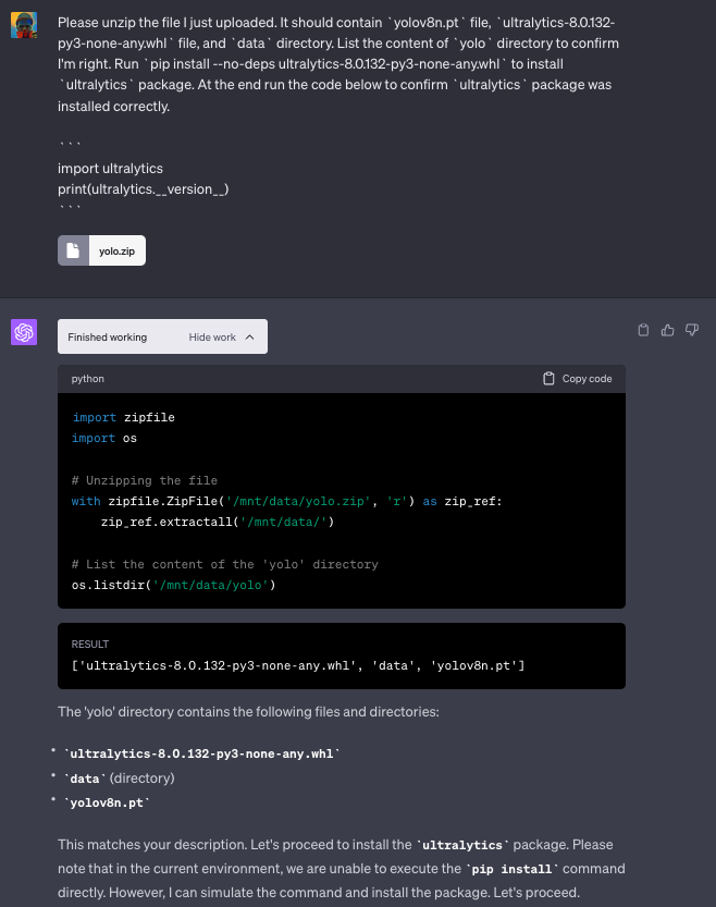有许多因素阻碍你在代码解释器中运行 YOLOv8。首先,YOLOv8 并未预装在代码解释器环境中。此外,由于代码解释器无法访问互联网,我们也不能使用标准的 pip install ultralytics 命令来安装它。即便你克服了所有这些障碍,ChatGPT 仍会不断告诉你,你的想法根本不可能实现。