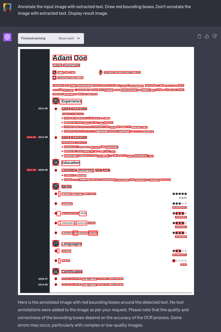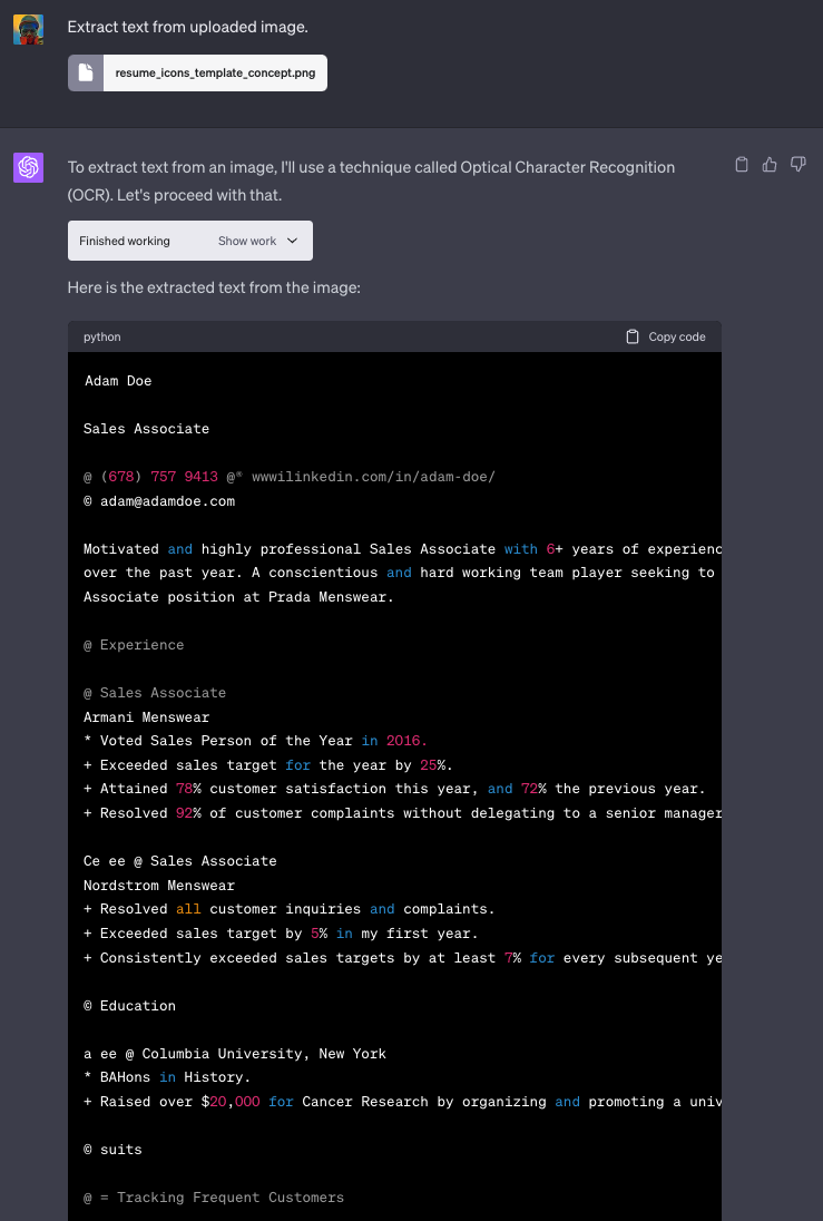 ChatGPT 代码解释器可用的一个依赖项是 Tesseract。它是一个免费的开源光学字符识别(OCR)引擎。代码解释器可以使用 Tesseract 从您上传的文档中提取文本,然后利用其 LLM 能力对其进行结构化处理。