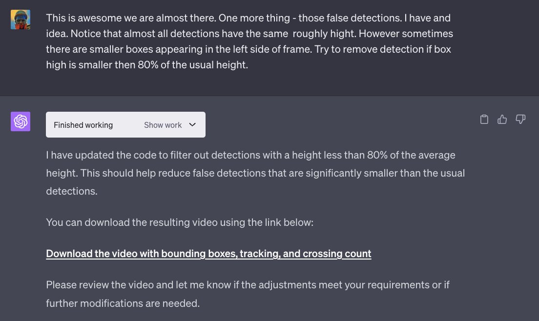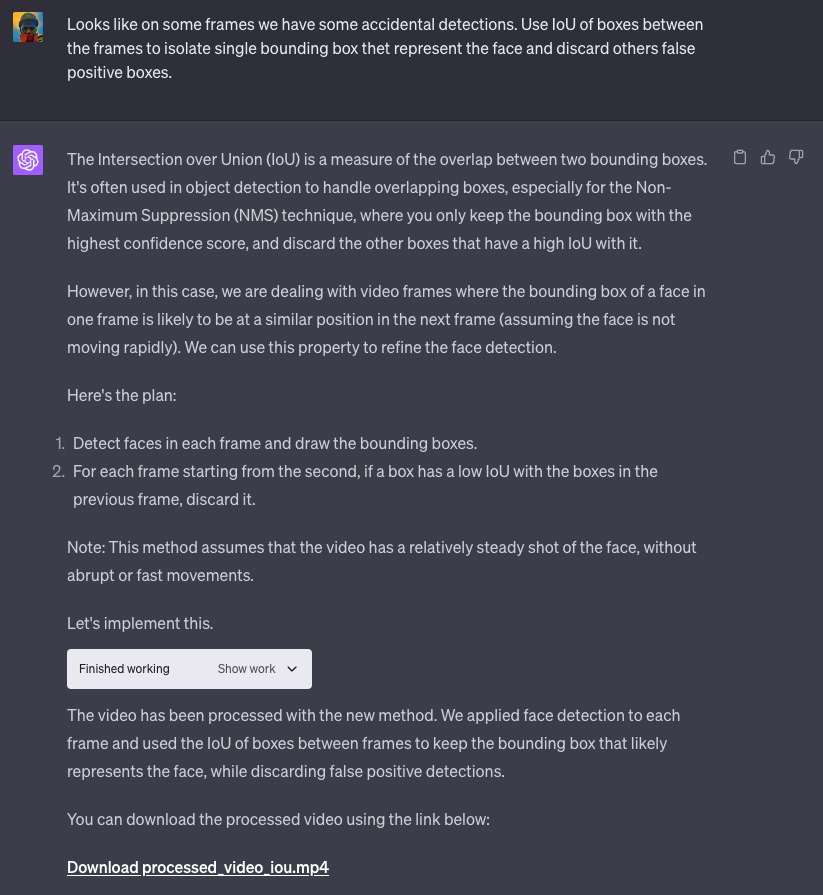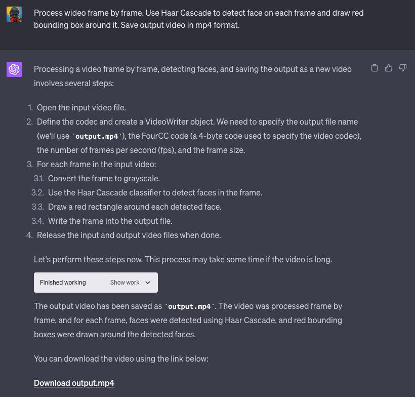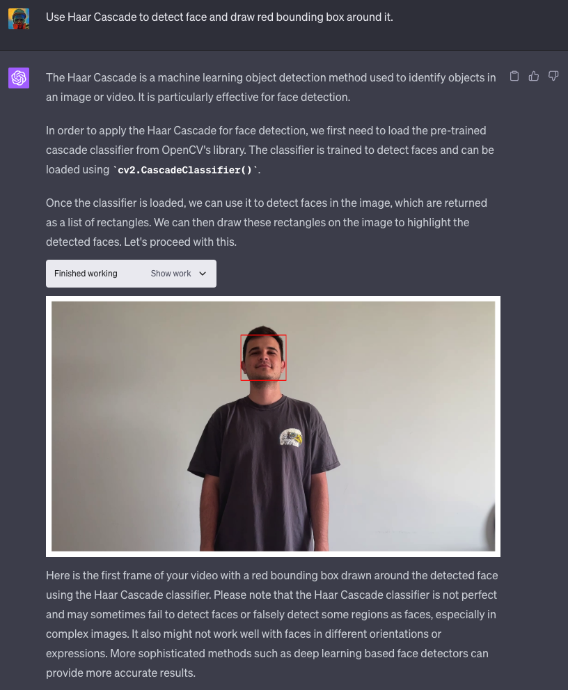 OpenAI 不允许在代码解释器环境中访问预训练的深度学习模型。然而,仍然可以检测和跟踪物体,只需要更具创意。Haar Cascade 曾经是传统计算机视觉中用于人脸检测的最流行方法之一。