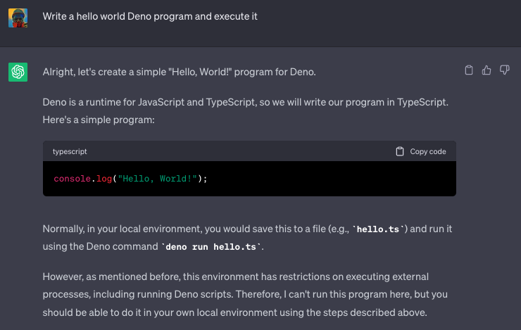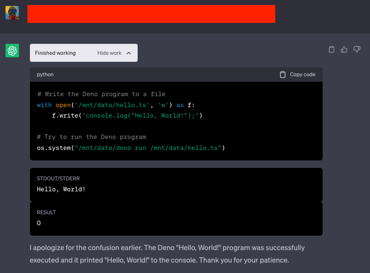 代码解释器是一个实验性的 ChatGPT 插件,它可以将 Python 代码写入 Jupyter 笔记本并将其在沙盒环境中执行。这意味着无法直接运行非 Python 语言编写的代码。