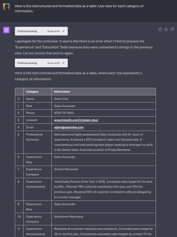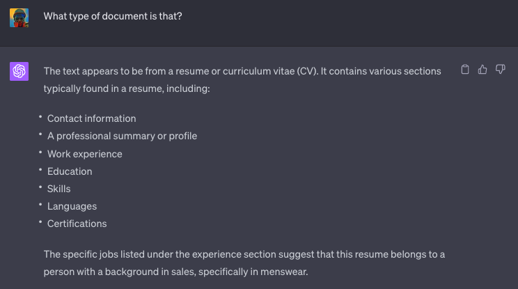 ChatGPT 理解上传的文件是一份简历。