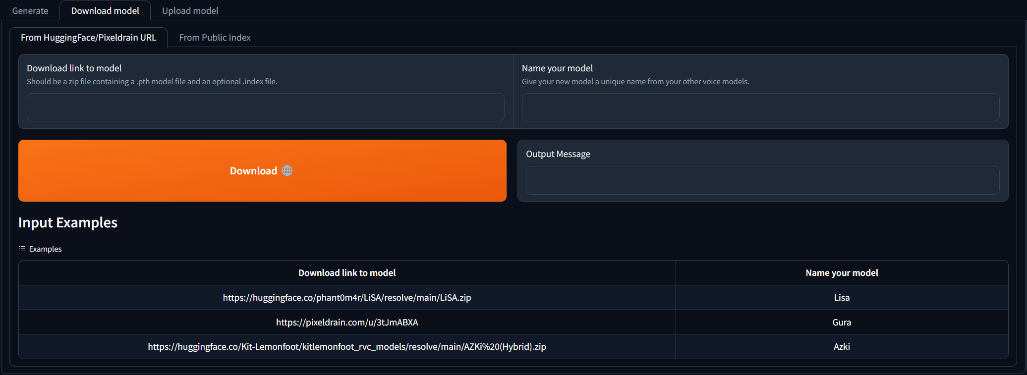 前往“Download model”选项卡,粘贴 RVC 模型的下载链接并为其命名。您可以在 AI Hub Discord 查找已训练好的语音模型进行下载。请参考示例了解下载链接的正确格式。下载的压缩包应包含 .pth 模型文件以及可选的 .index 文件。