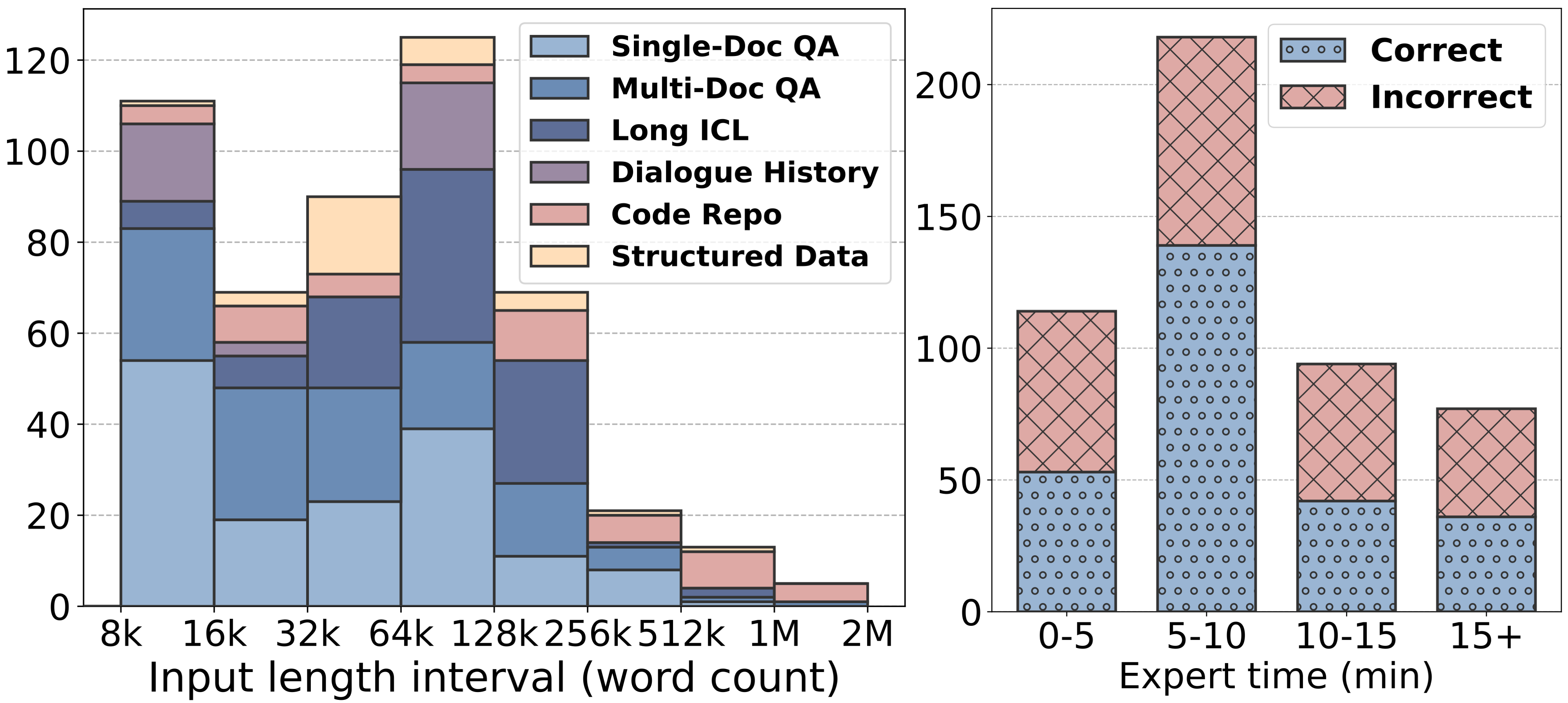 LongBench v2 旨在评估大语言模型(LLMs)处理需要深度理解和推理的现实世界多任务中长上下文问题的能力。LongBench v2 具有以下特性:(1) 长度:上下文长度从 8k 到 2M 词不等,大部分在 128k 以下。(2) 难度:极具挑战性,即使人类专家使用文档内的搜索工具也无法在短时间内正确回答。(3) 覆盖范围:涵盖各种现实场景。(4) 可靠性:全部采用多项选择题格式以确保评估的可靠性。